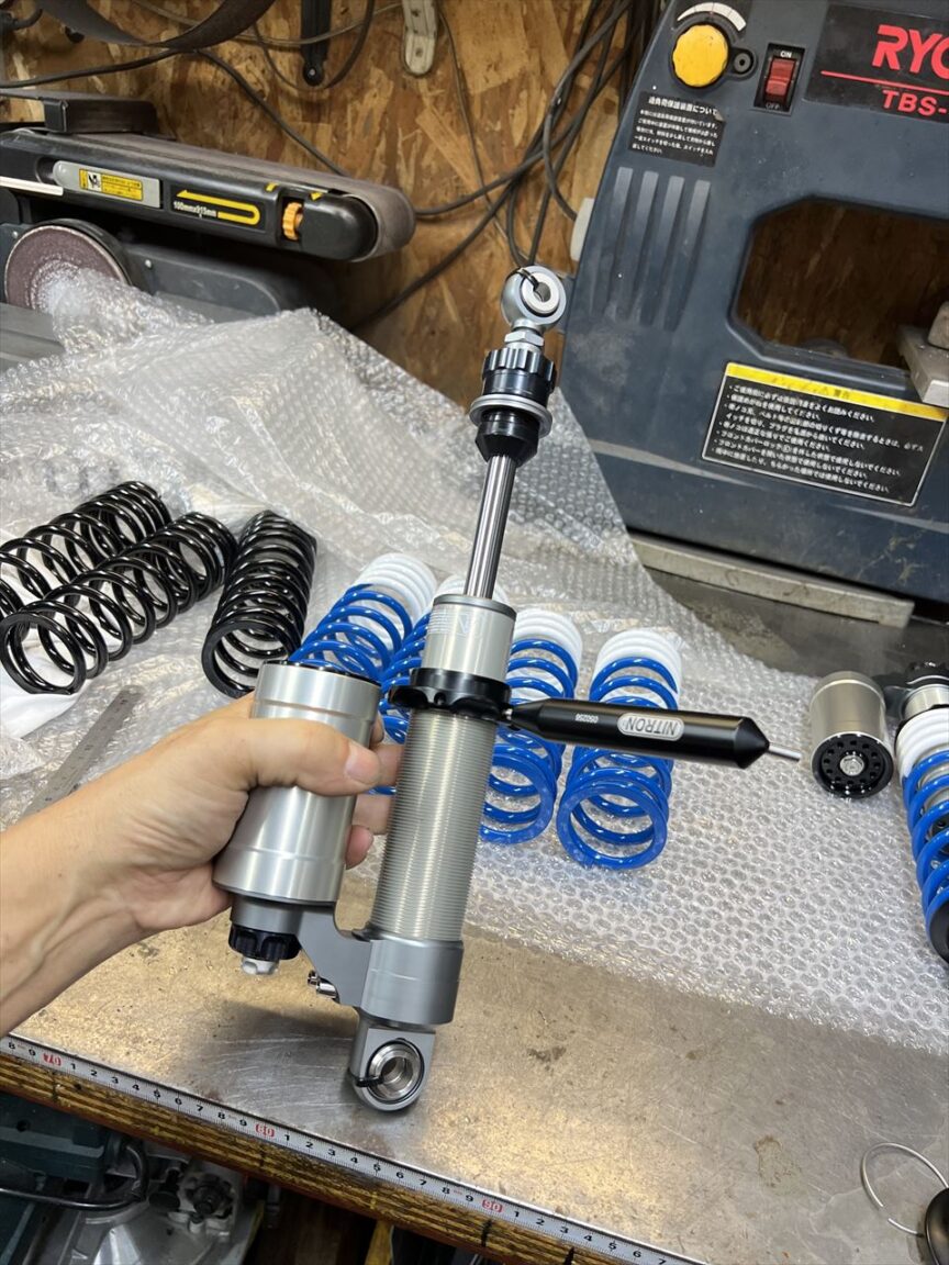 ナイトロンR3リヤショックのGREEN GARAGEバージョンが入荷しました。今回は5月に3セット注文して納品まで約3ヶ月かかりました。2色塗分けのスプリングは別途スプリング単体を塗装屋さんに送って施工していただいている物で、こちらもようやく仕上がってきたので組み立てます。