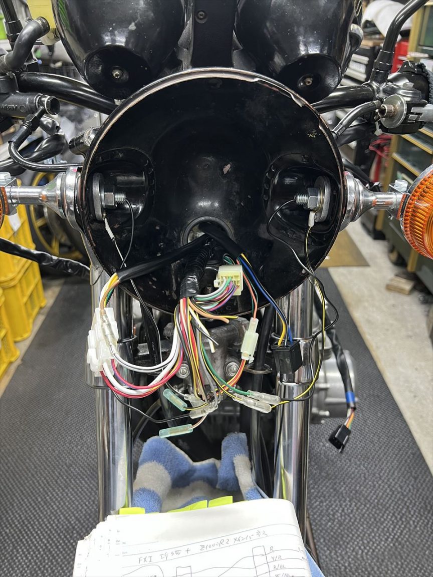 ノーマルサイドスタンドは、左側のノーマルマフラーを避けるために結構張り出しています。ワークスバックステップはステップをできるだけフレームに寄せたスリムな作りです。そのためチェンジペダルと干渉する場合があり、今回も若干当たるのでサイドスタンド側を修正します。因みに、市販のバックステップキットの場合はそれを回避するため、位置が高く、外側に張り出した設計になっている物がほとんどで、ひざの曲がりがきつく、乗車姿勢がガニ股になりがちです。