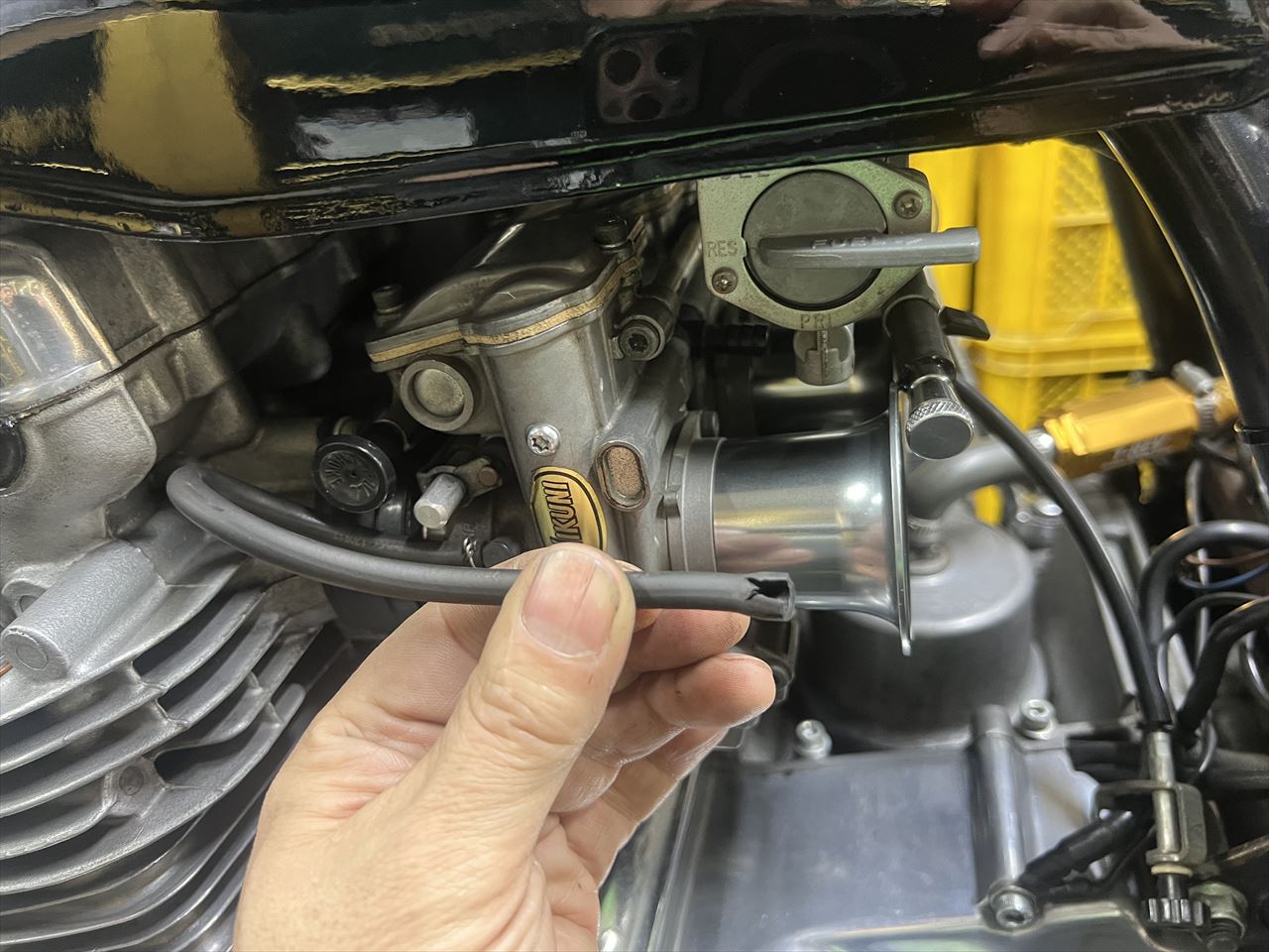 タンクを外す時に負圧ホースのコック側が裂けていました。このあたりも燃調が変わってしまうので要注意。