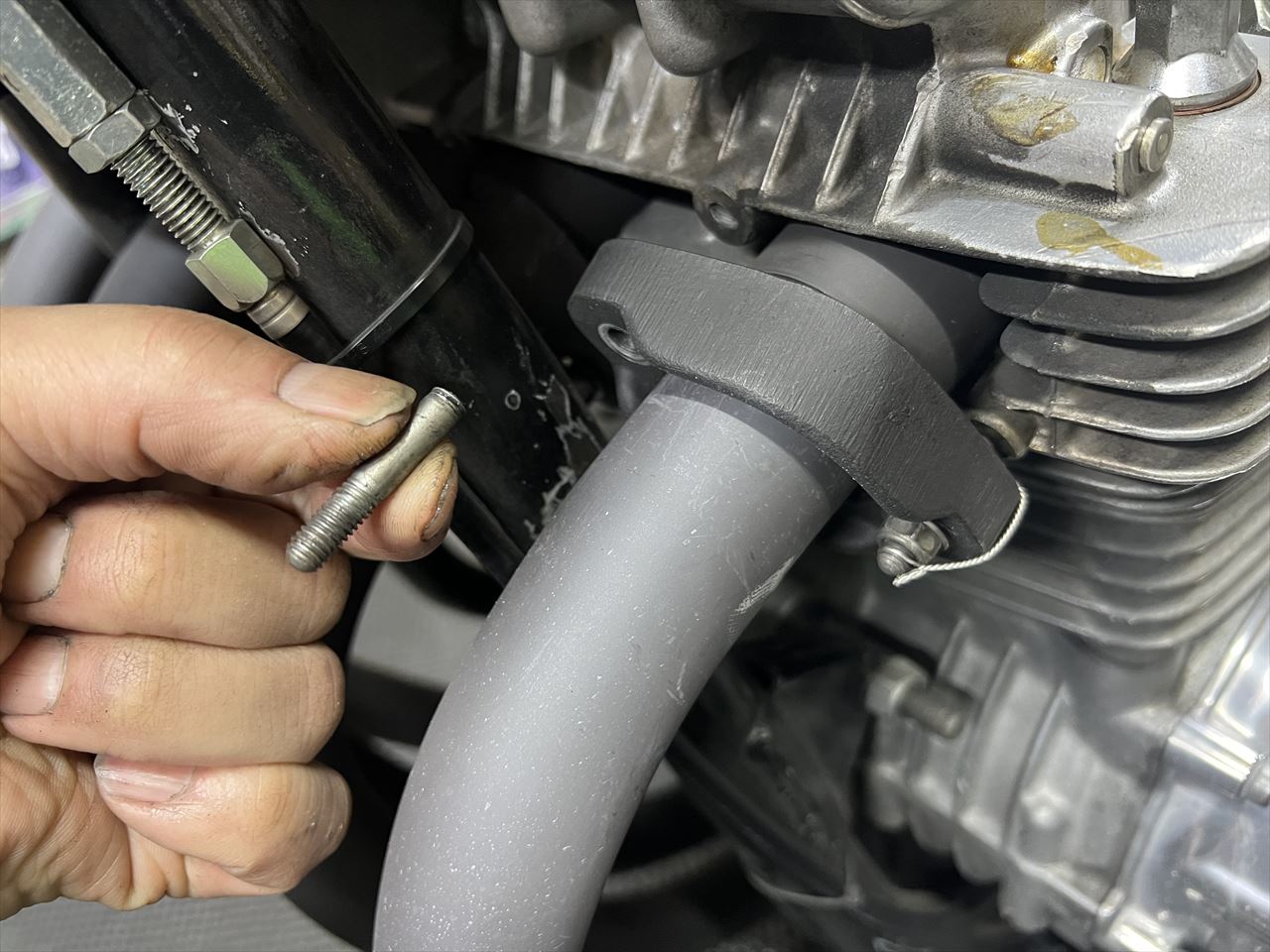 エンジンから異音がするとのことで点検したところ、排気漏れとわかり、マフラーフランジのところを増し締めしようとしたらちょっと触っただけでエキゾーストスタッドが折れてしまいました。