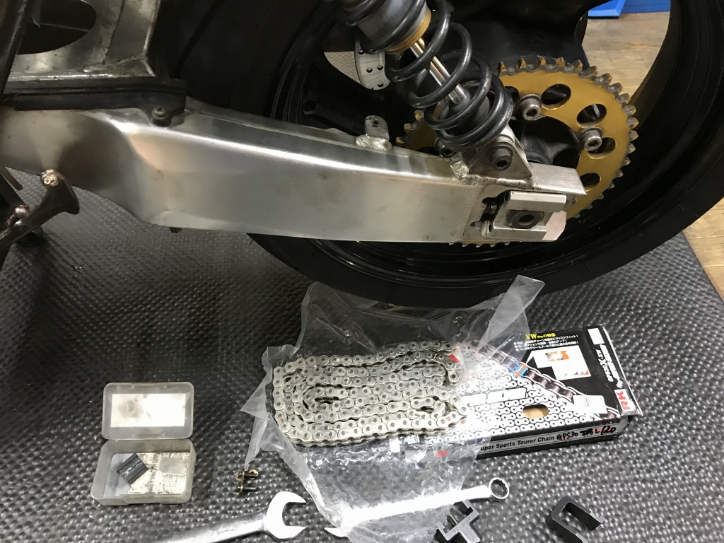 ドライブチェーンの長さが足りないことが分かったので、2コマ長い物に交換します。先ず既存のチェーンを切断します。