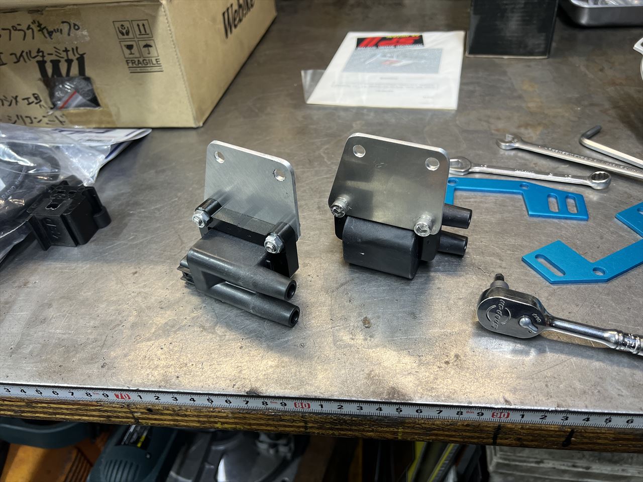 電装系全交換の最終段階は、点火系をウオタニSP2に変更します。イグニッションコイルのステーはJ系用の設定が無いのでいつもジュラルミン板で製作しています。