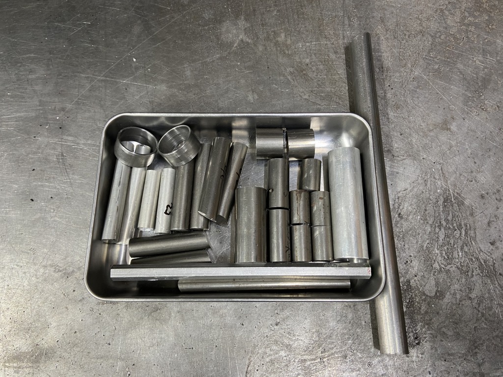 今回のS1仕様に使う棒材をまとめて切り出したものがこちらです。ステップ関係やハンドルストッパー、オイルクーラーブラケット、脱着式サイドスタンドのボスなど、半分くらいはフレームに溶接するパーツとなります。