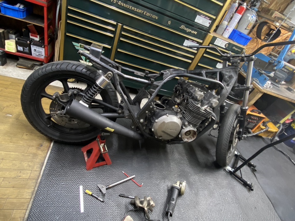 エンジンを下ろす前にマフラーステーを加工します。