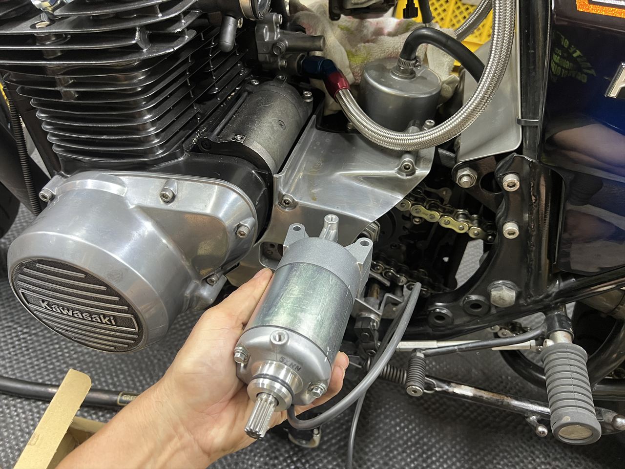暖気後、スターターの回転不足で始動性の悪かったので、スターターモーターの劣化を疑い現行新品の純正品に交換します。カワサキの在庫表示は「在庫僅少」となっているのでもうすぐ廃盤になるようです。未交換の方は無くなる前にキープしておくことをお勧めします。