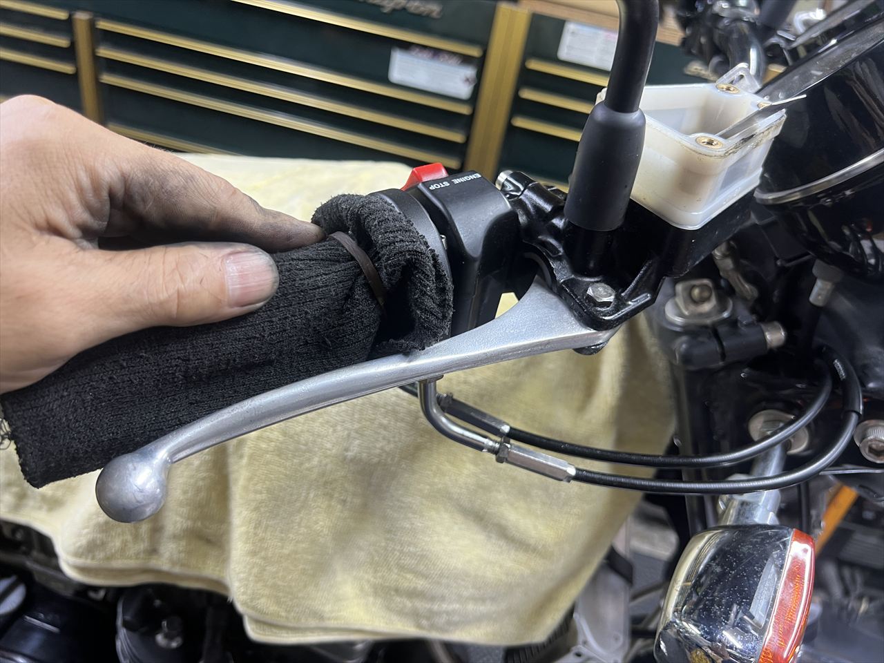 フロントブレーキのフルードを交換すべく、キャリパーのブリーダーを緩めてレバーをフルストロークさせたところ、レバーが戻らなくなりました。ピストンが奥で引っかかっているようです。