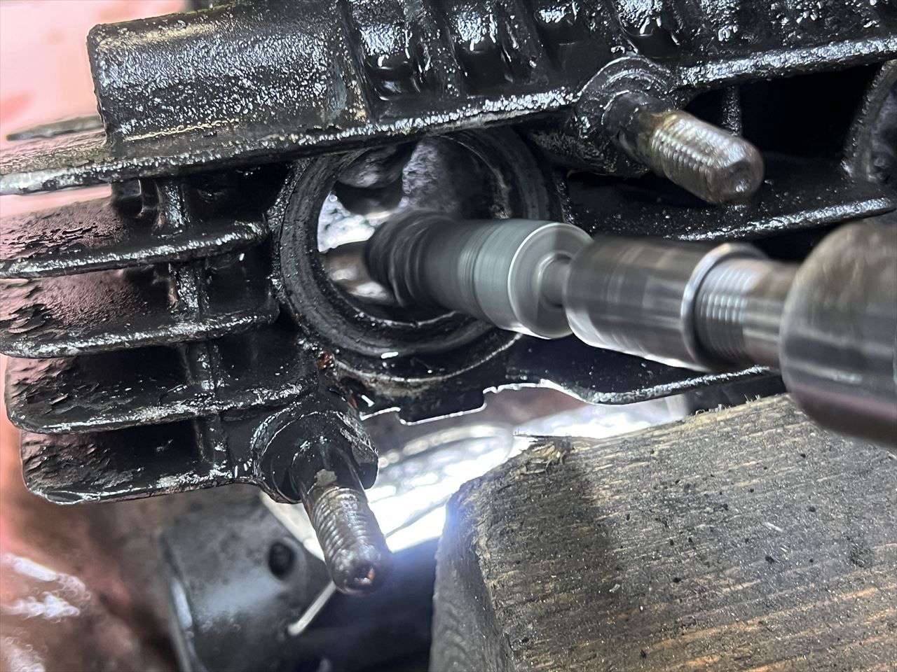 リヤショックはナイトロンR3の弊社オリジナルスペックを使用中です。スイングアームも弊社のワークスタイプを装着済みで、リヤショックのマウントは外側に10ミリオフセット可能な仕様です。車体の方は後付けのタンデムステップが装着されており、大体この辺りにリヤショックのアッパーマウントを設置できそうです。