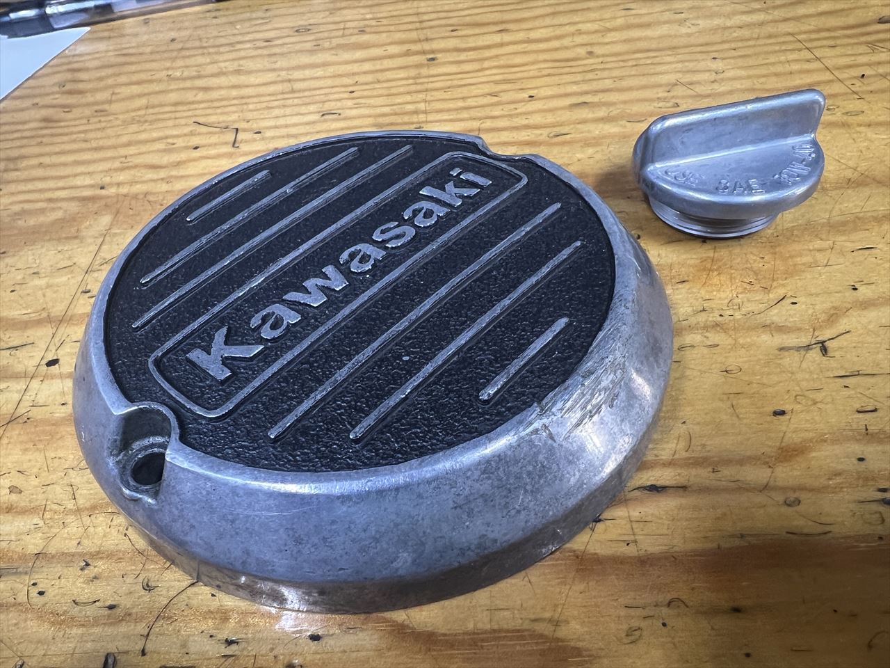 モリワキのポイントカバーは、純正の中古品を探して入手、これを塗装します。油温計だったフィラーキャップは純正新品に交換。