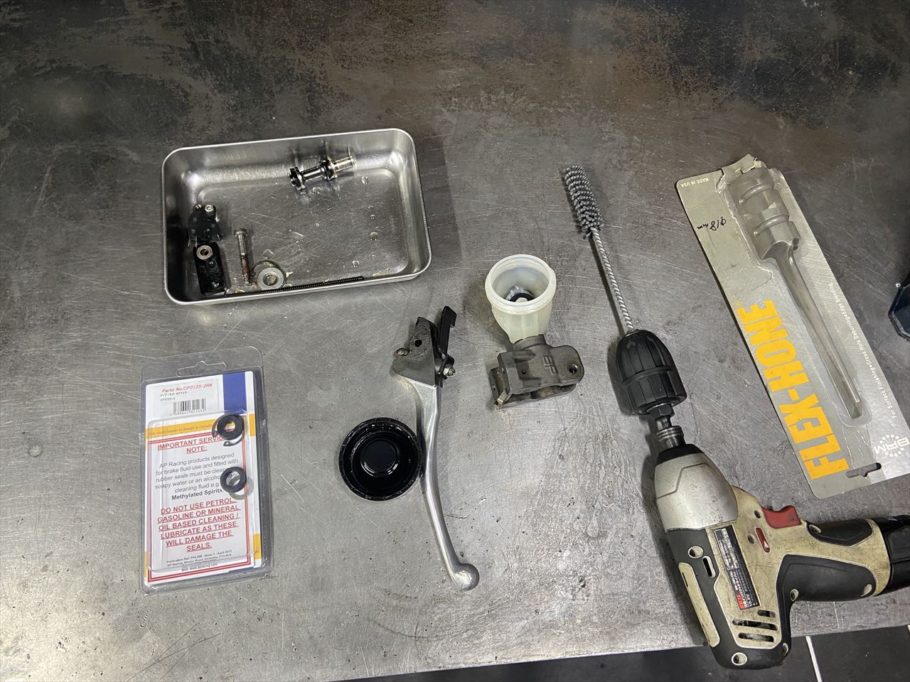 分解したマスターと、入荷したシールキット、それからシリンダー内面研磨に使うフレックスホーンです。