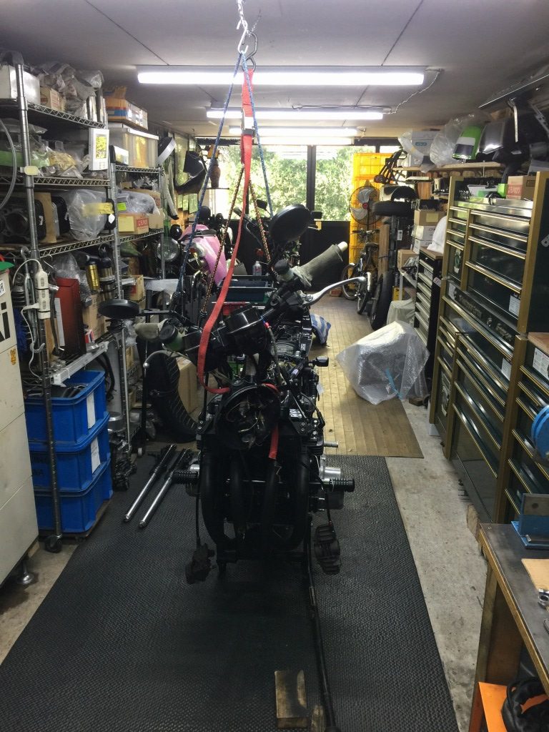 過去の転倒によるものか、新しいクランクケースで組んだエンジンのマウント位置が合いません。そこでフレーム修正します。