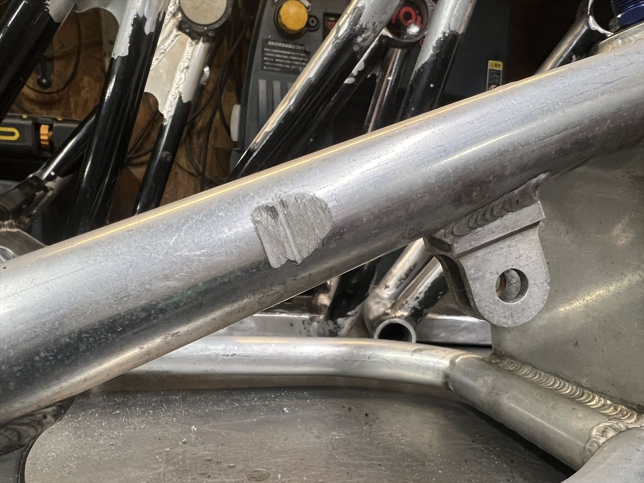 右側のメインパイプに大きな削れがあります。おそらくサイレンサーの取り付けボルトかステップが干渉して削れたものでしょうか。穴が開きそうなほど深いキズです。