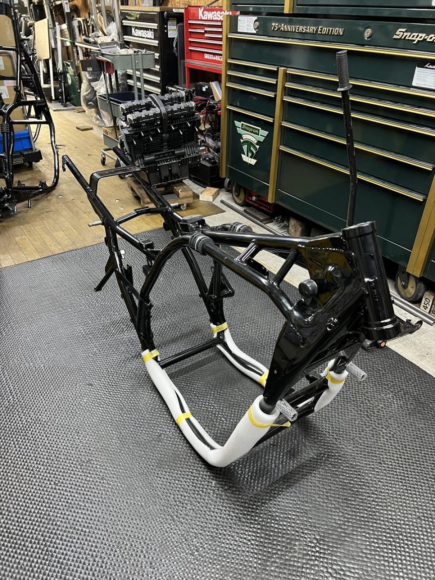 フレーム載せたタンクを裏から見るとこんな感じです。通常角タンクは前から後ろまで全く干渉しませんが、こちらのアルミタンクはやや干渉して削れた跡がありました。