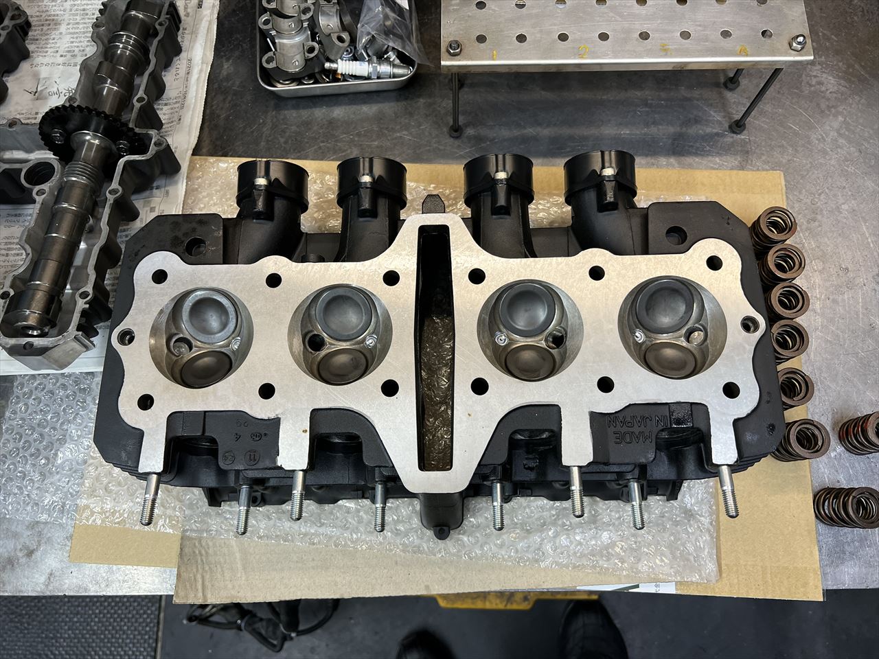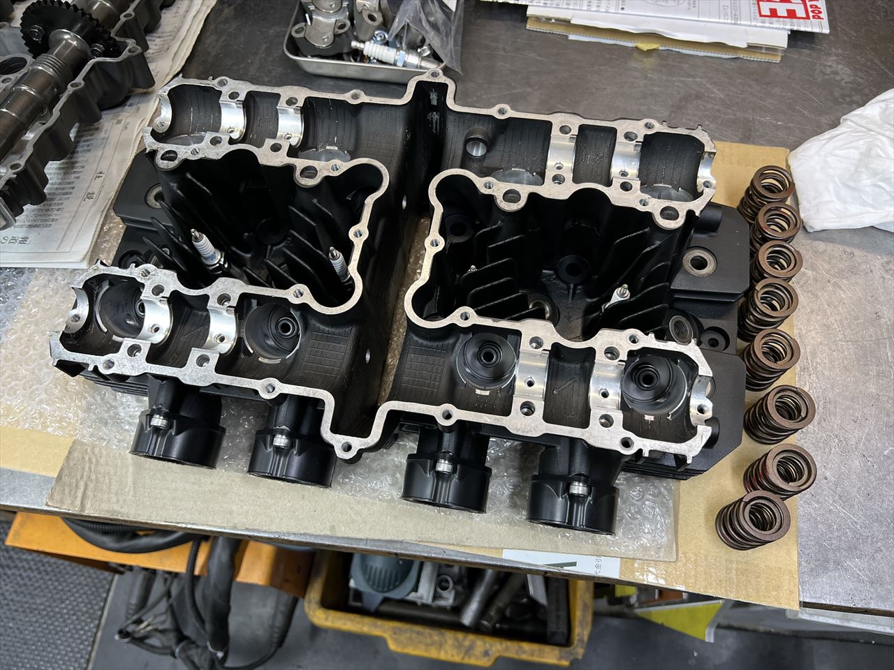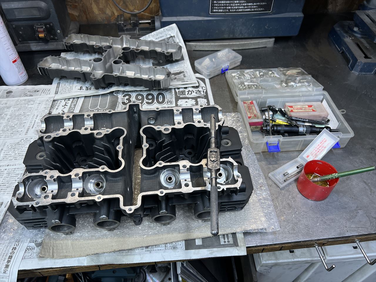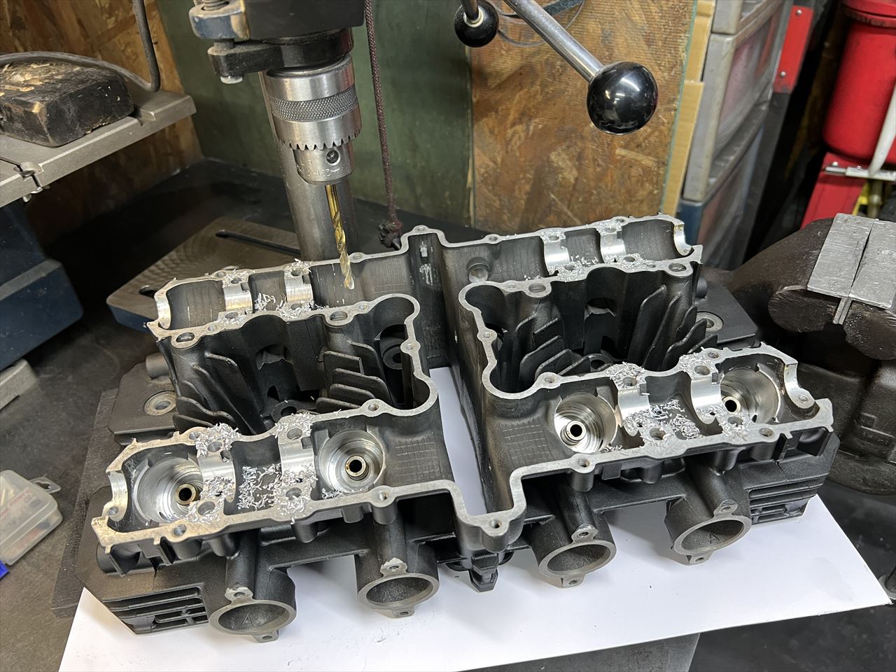 お持ち込みのツインプラグ加工済みヘッドを修正して使います。先ずは、カムホルダーネジは全てヘリサートを入れるので下穴を開けます。