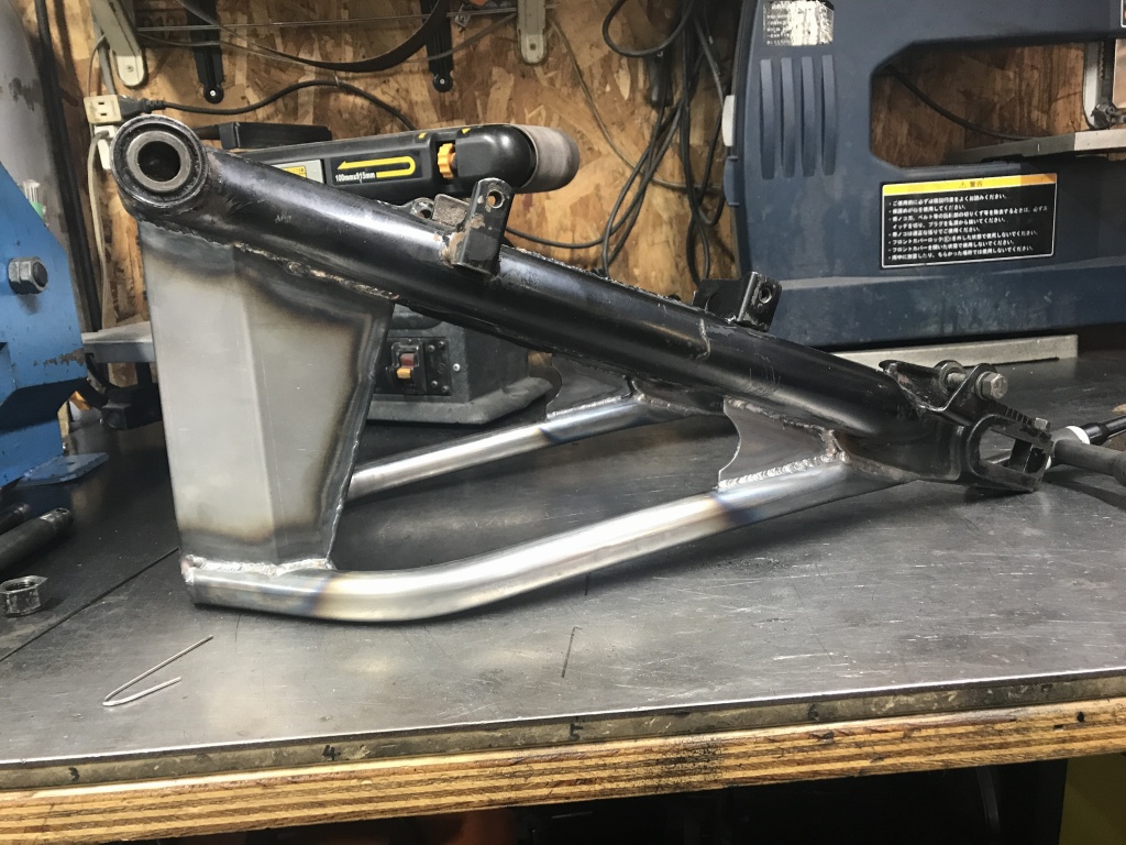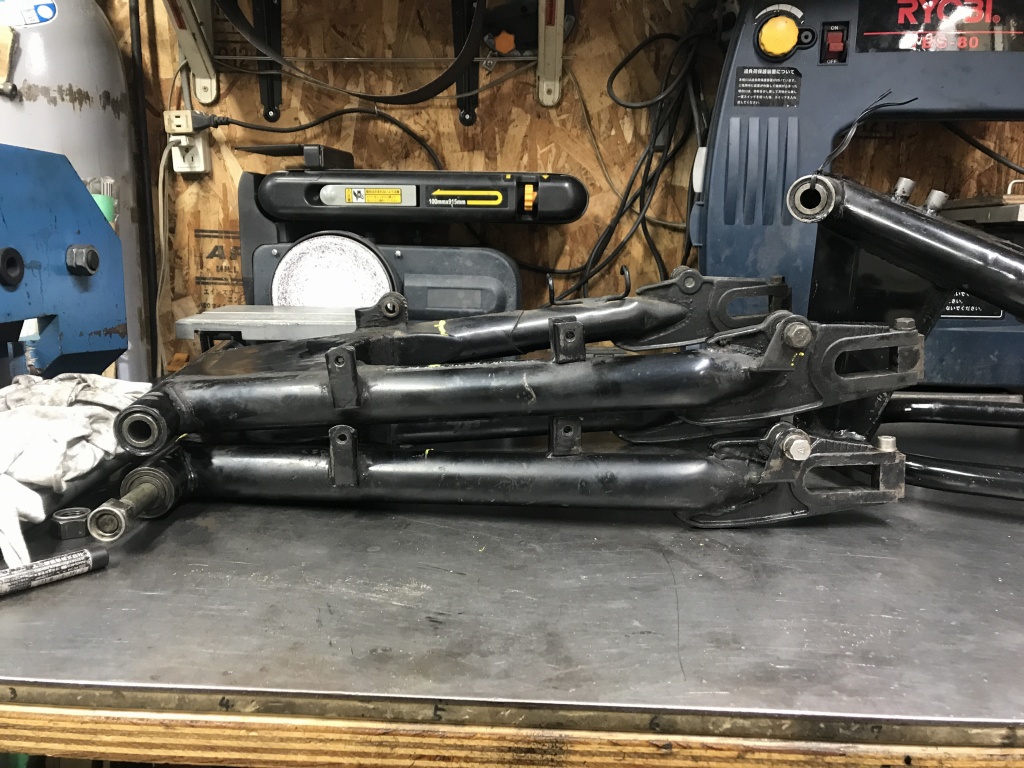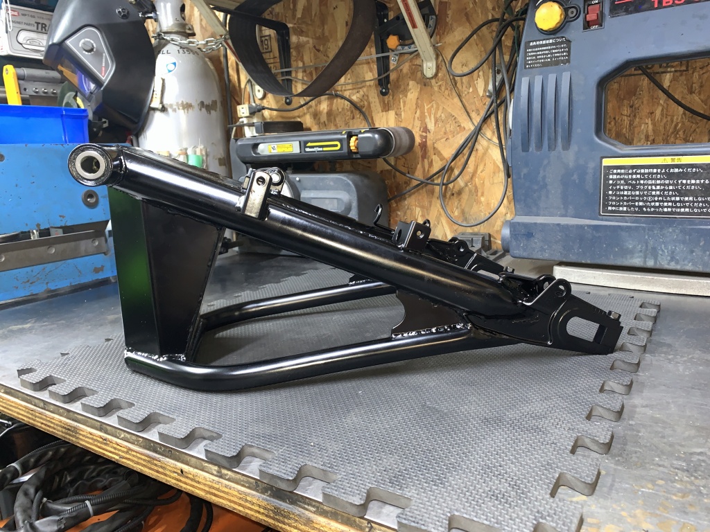取り付けるスイングアームはこちら。純正スイングアームに弊社オリジナルのトラス補強を施したものです。重量は重くなりますが、実感できるほど剛性は上がります。