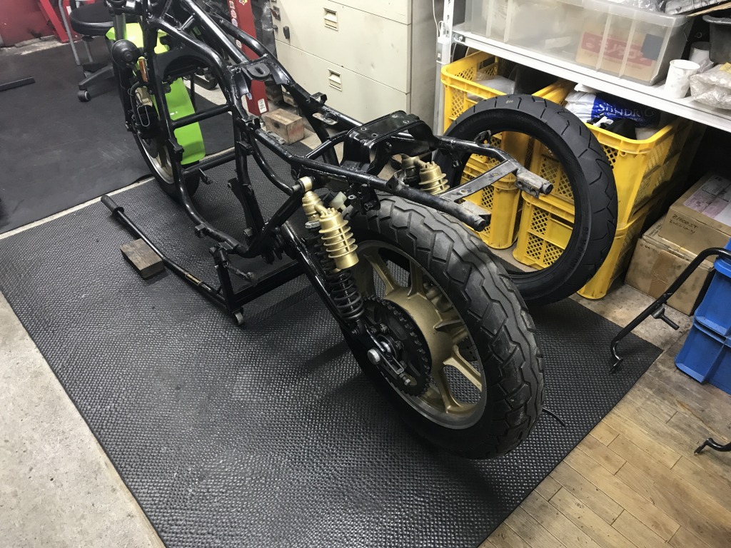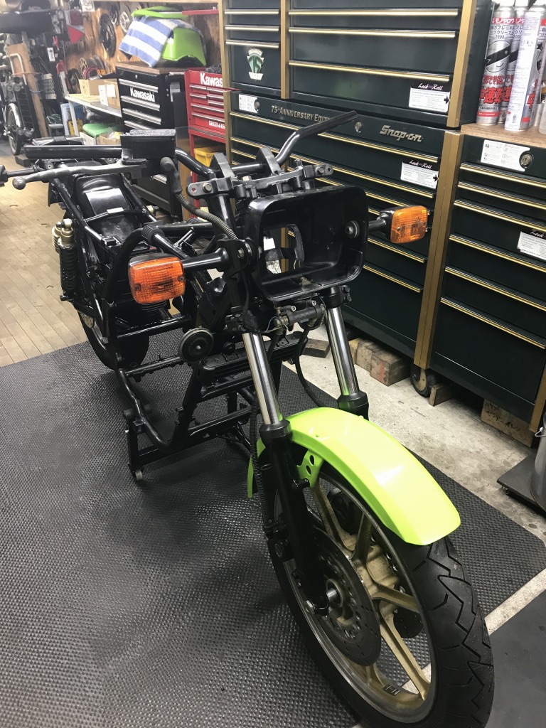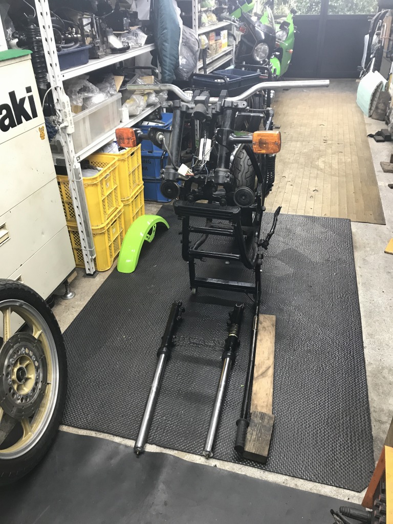 フロントをジャッキアップすると、ステアリングの動きが渋く、中立位置で引っかかりを感じるので、予定していたフォークオイル交換と合わせてステムベアリングも交換します。