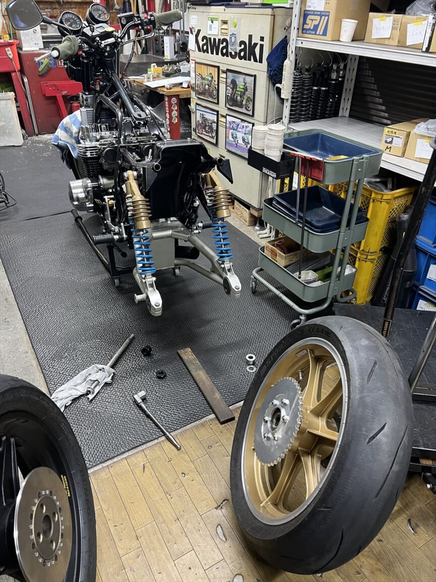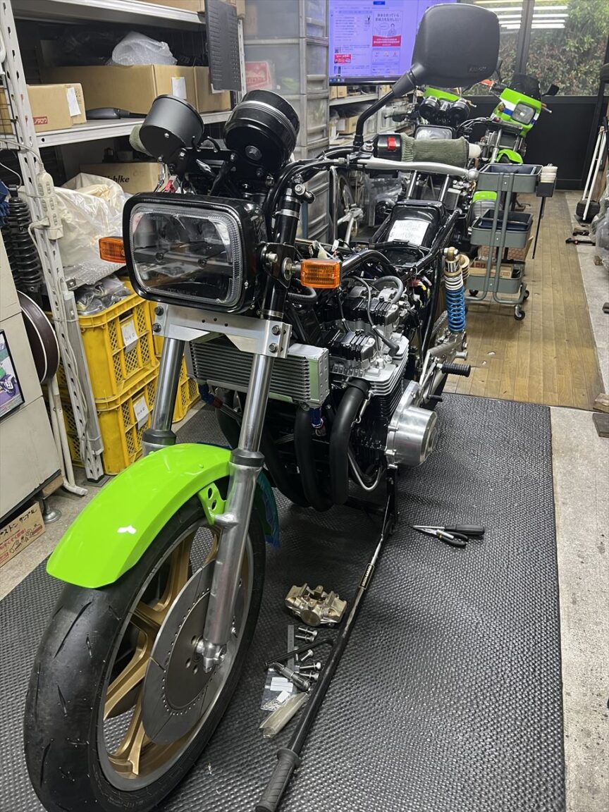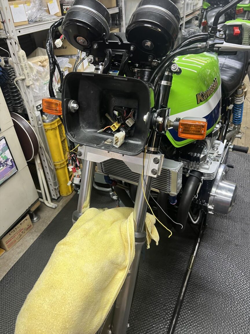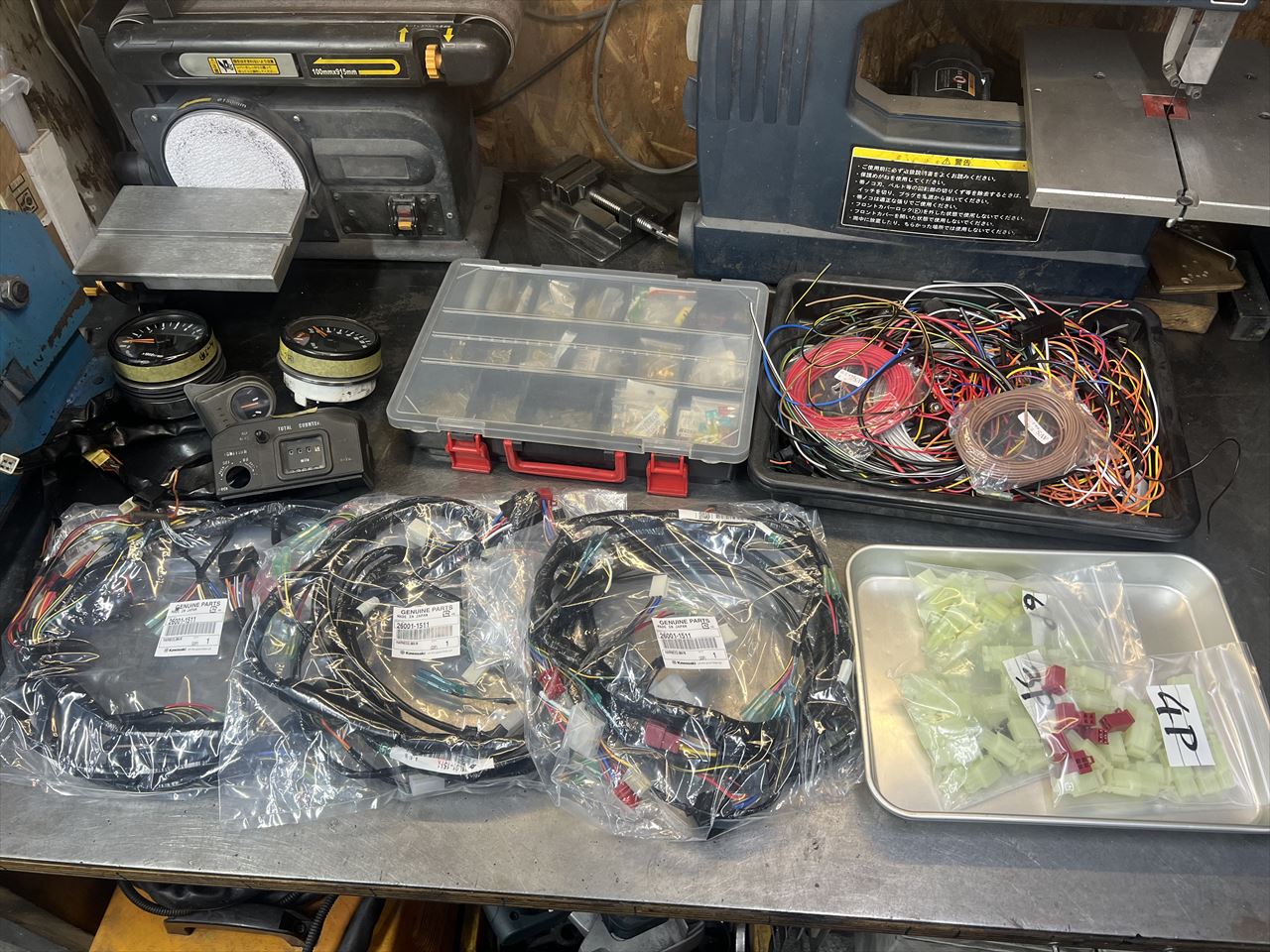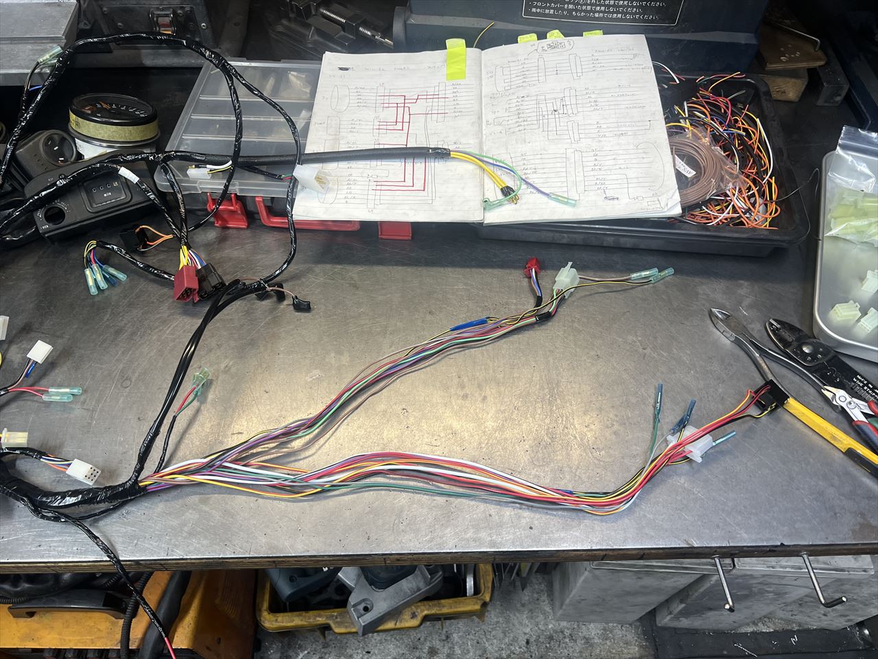 メインハーネスを交換します。素材はZ1000-R2純正新品で、角メーター用なので丸メーター用に改造します。合わせて前半はいつものようにスリム化し、その他にもちょっとした定番の変更を加えます。今回は同様の加工をまとめて3台分行います。