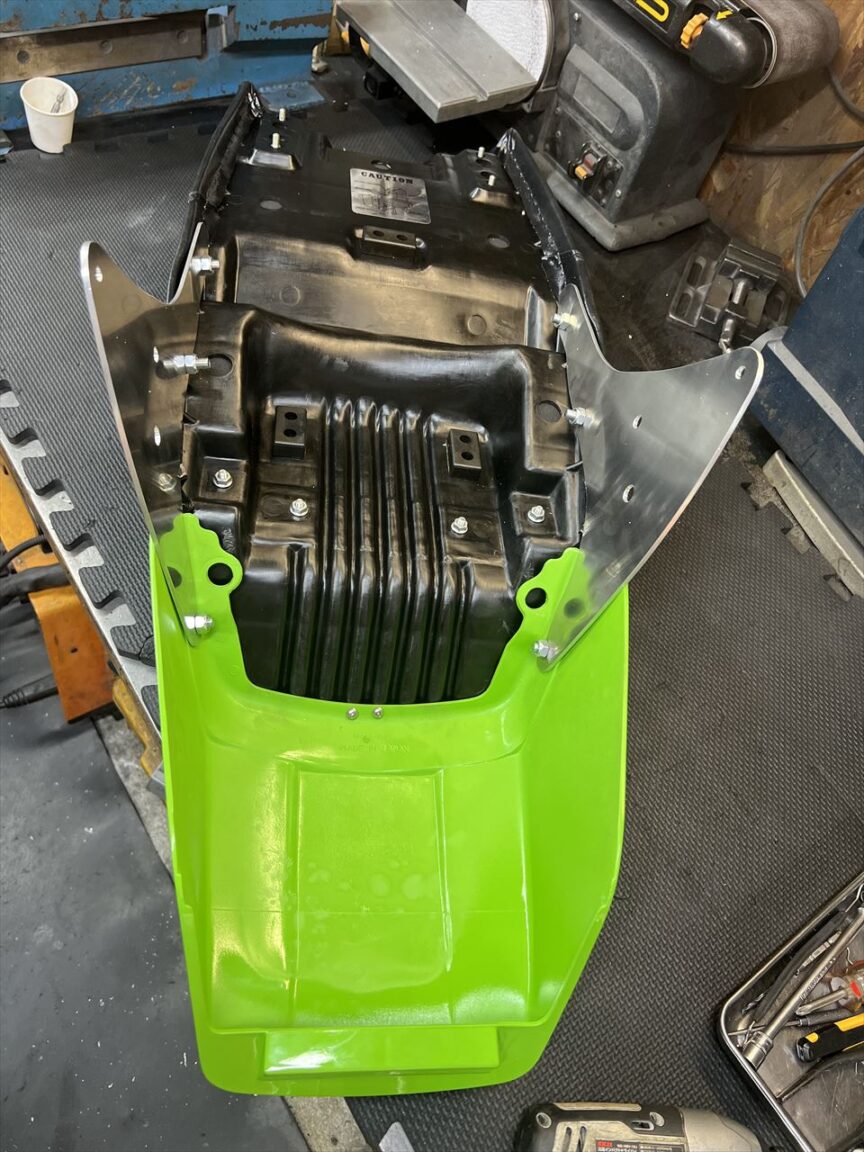 テールカウルを裏側からシートに直接ネジ止めし、三角のシートブラケットで更に固定します。