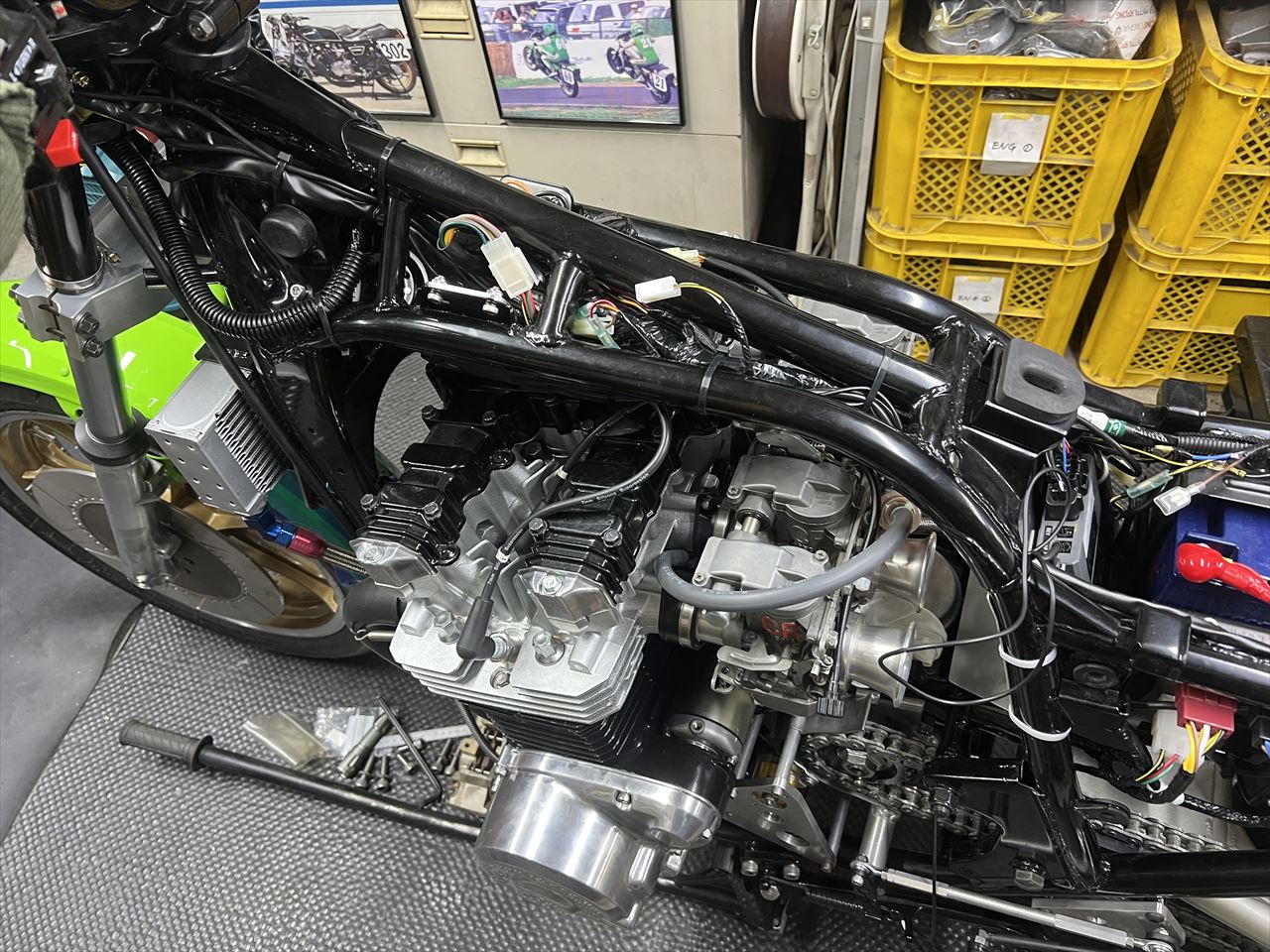 エンジン上部のハーネス類はなるべくコンパクトにまとめ、ヘッド周辺の冷却風の流れを妨げないようにレイアウトします。
