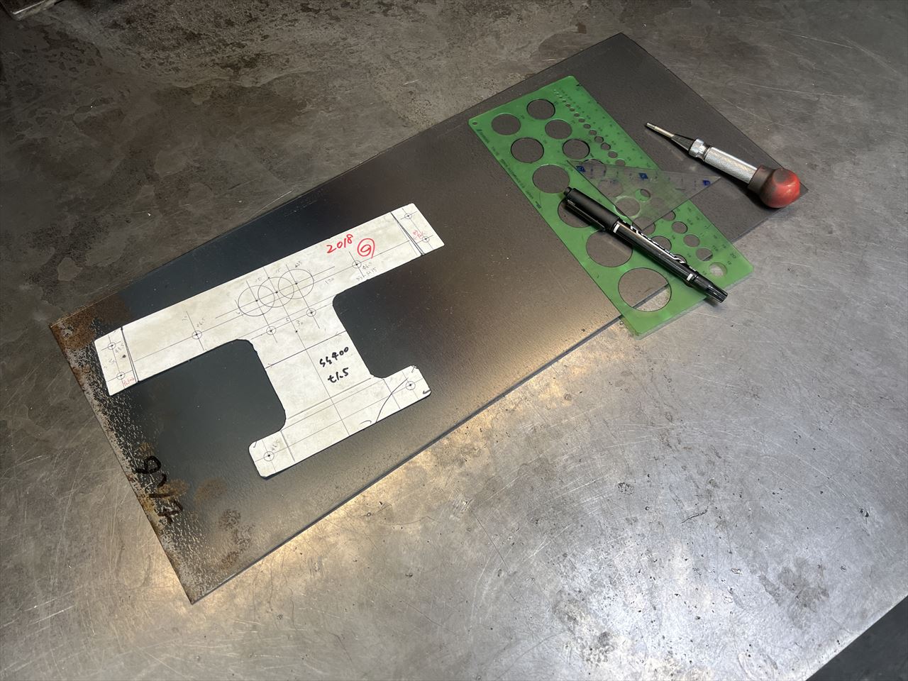 S1同様にテール周りを一体化します。テールレンズとリヤフェンダーは、このようなブラケットで支持されています。S1から採寸したテンプレートを元に鉄板から切り出します。