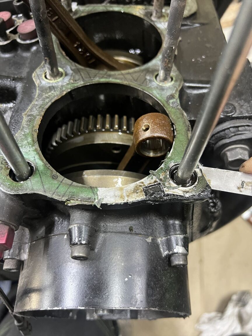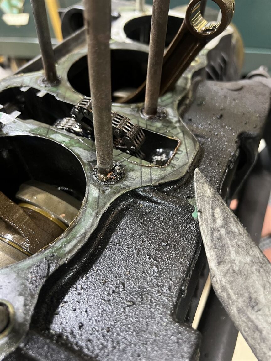 酷いオイル漏れを起こしていたシリンダーベースのガスケットを剥がします。実はエンジン腰上はこの車両入手時に、納車整備として分解整備したと聞いていたとのこと。たった数年でここまで漏れるのでしょうか。