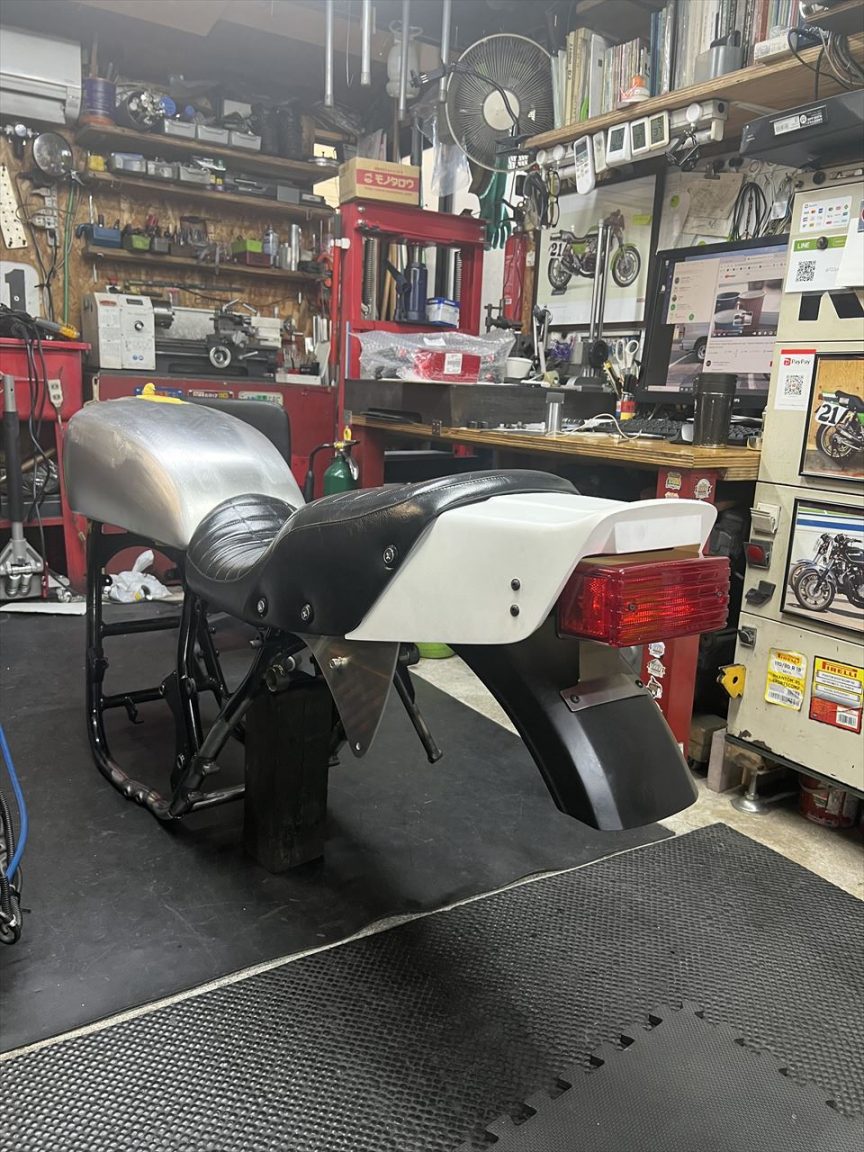 作業も大詰め。テール周りの一体化が完成しました。テールレンズはS1同様の赤レンズです。車種はKZ1000CSR、部品番号は 23026-1024 で、今でも購入可能です。