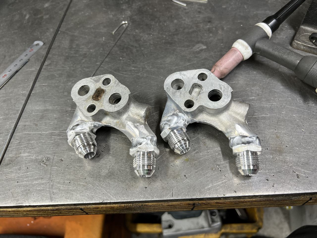純正のオイルクーラー取出しを加工して使います。ダミーエンジンを治具代わりにして溶接で仮止めします。