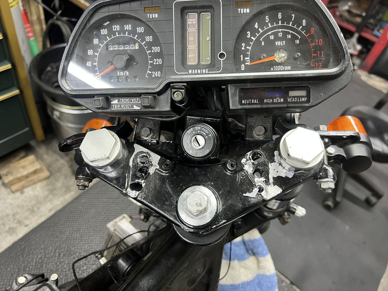 ハンドルはB2の純正アッパーステムに穴開けして背の高いハンドルポストで付けられていました。穴の形状から加工の苦労が伺えます。