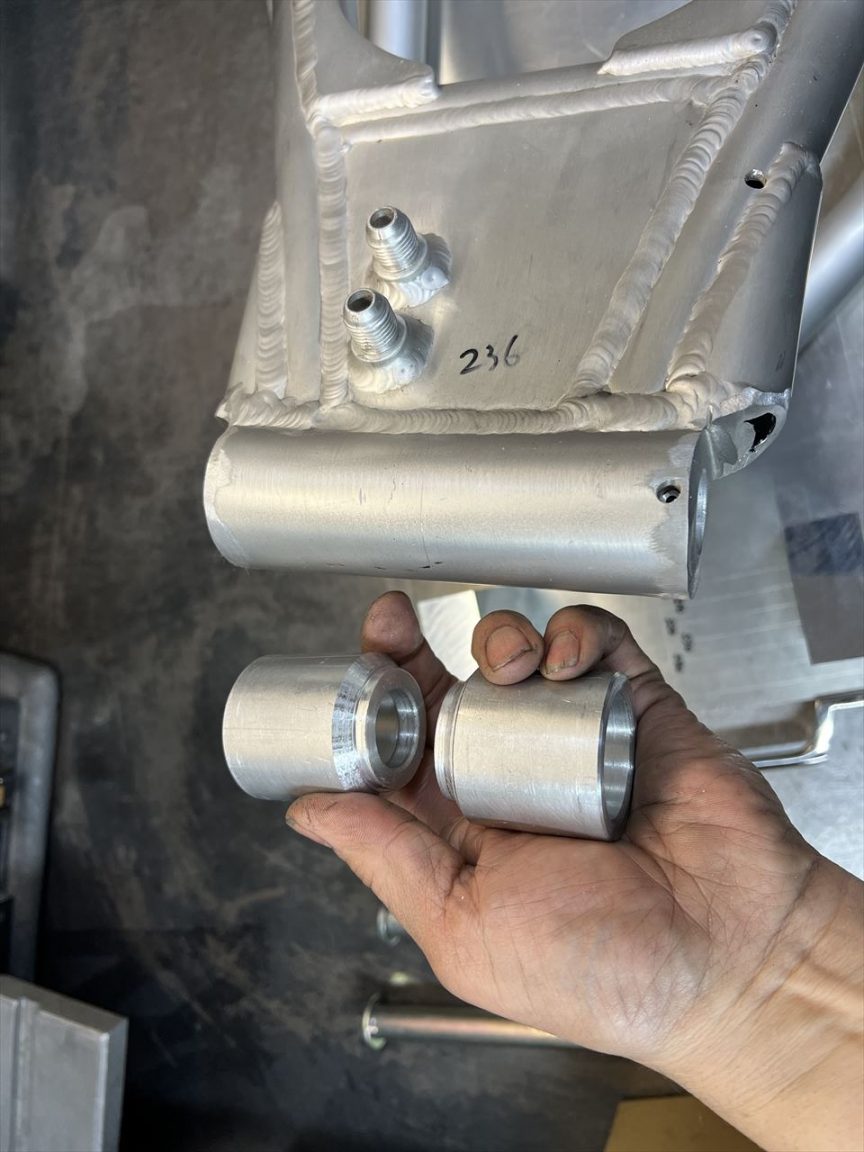 ピボットのテーパーベアリングハウジングが広がって使えなくなったワンオフのS1スイングアームでしたが、ピボットべリングハウジングを作り変えてニードルローラータイプに改造して修理します。既にピボットべリング部分は前回までに削除済みです。