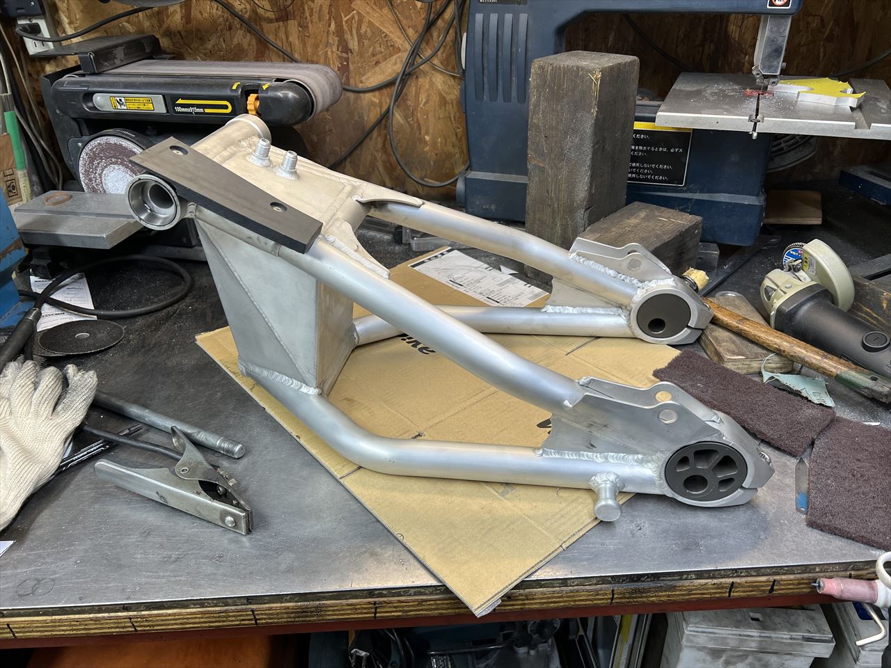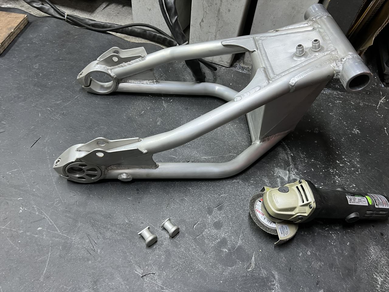 裏側はこんな感じ。標準のエキセンに対し、このスイングアーム用に合わせて寸法をアレンジしています。スイングアームは、スタンドフックをS1同形状に変更。