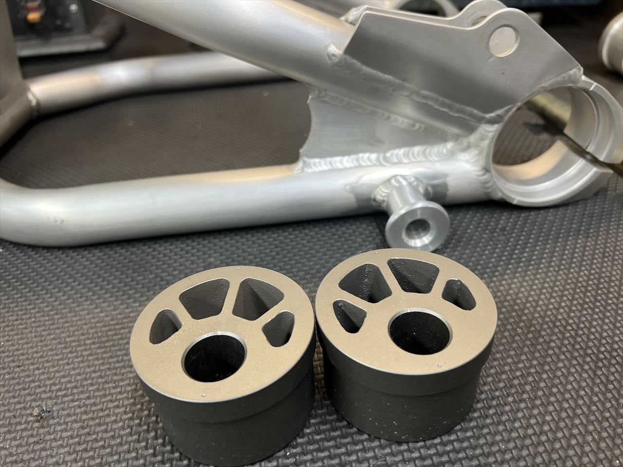 修理と改造中のS1スイングアーム、このスイングアームに合わせたエキセントリックがようやく完成し、残すはそのエキセンのアルマイトのみとなりました。エキセントリックを特注したのは、エンドの左右ゆがみが大きく、通常の貫通シャフト式だとシャフトが通せなかったのと、ハウジングの幅が手持ちのエキセンより広かったため、今回は特注製作となりました。