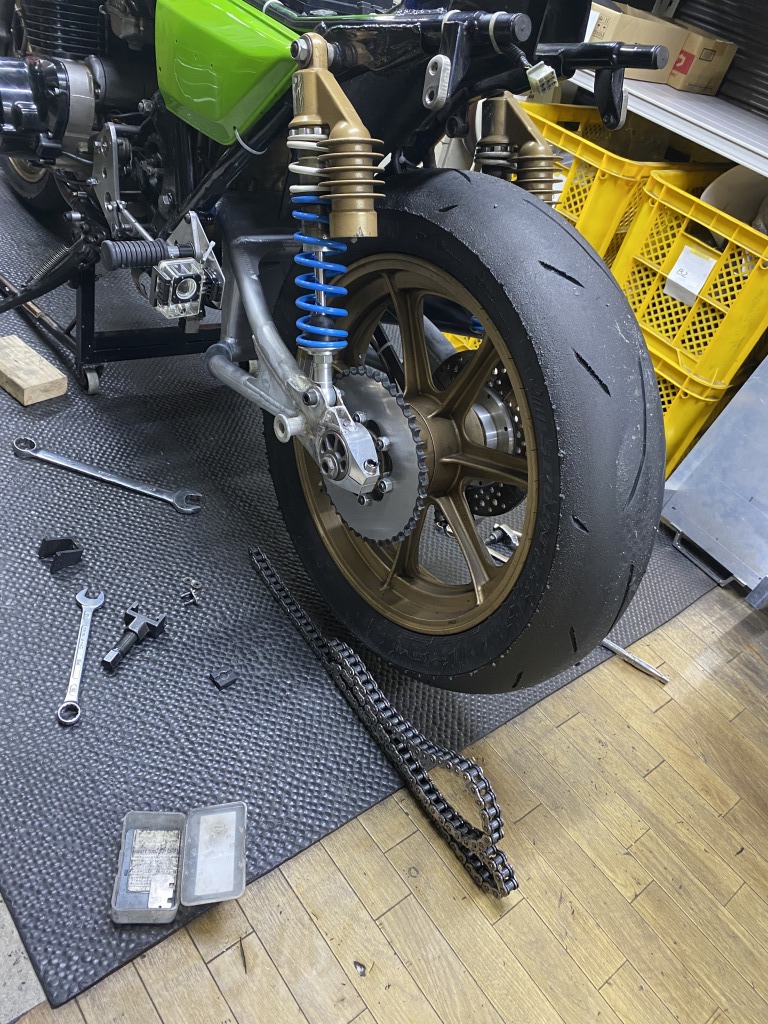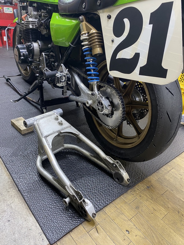 修理したS1スイングアームの走行テストを筑波サーキットで行い、無事終了しました。確認が取れたので外して塗装にだします。