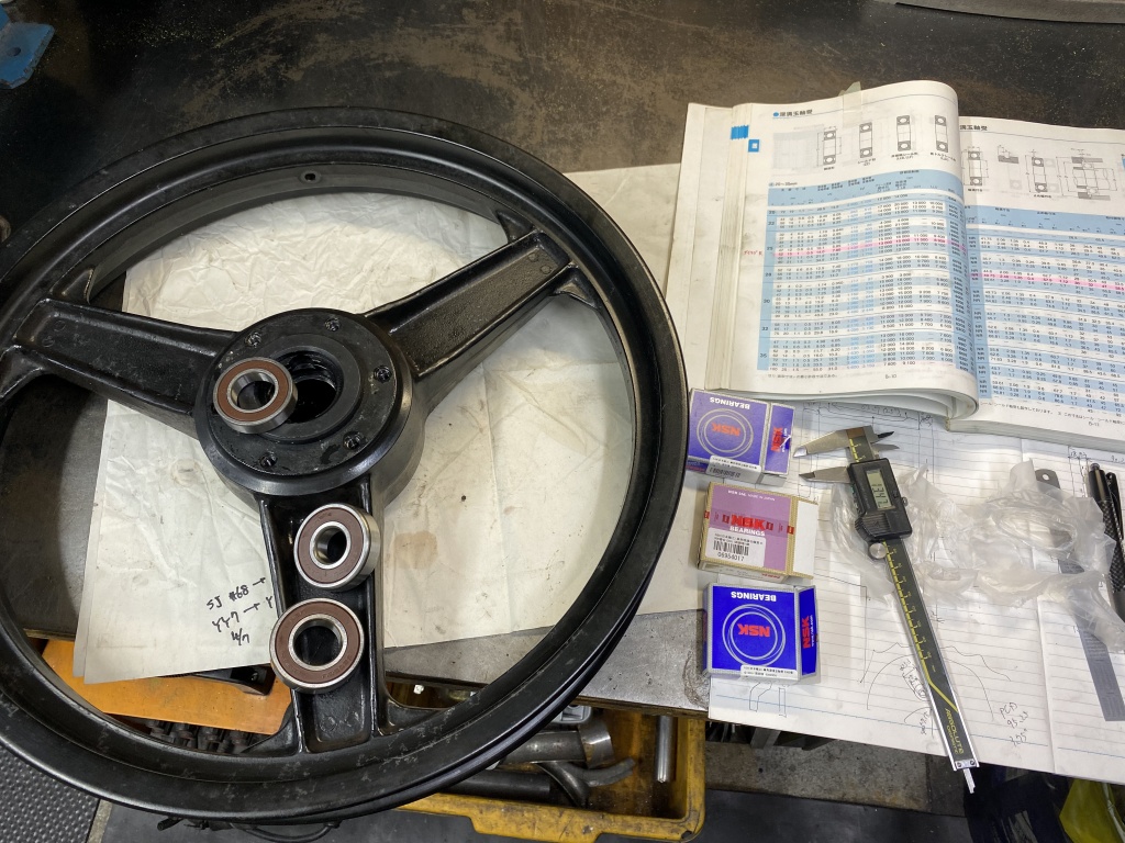 細かく採寸し現状を把握。少し大きなベアリングが使えないか、ベアリングのカタログを見ながら検討します。