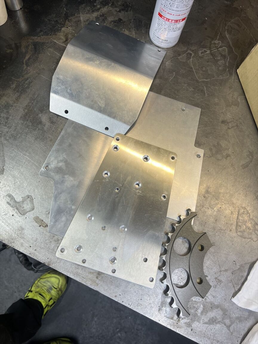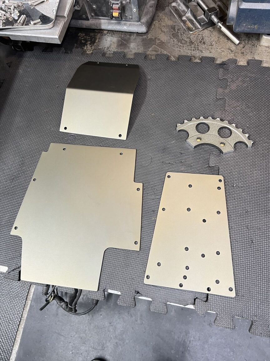 各電装ユニットの取り付け穴開けが終わった電装パネルとリヤのインナーフェンダーは、色見本のリヤスプロケに合わせてアルマイトします。