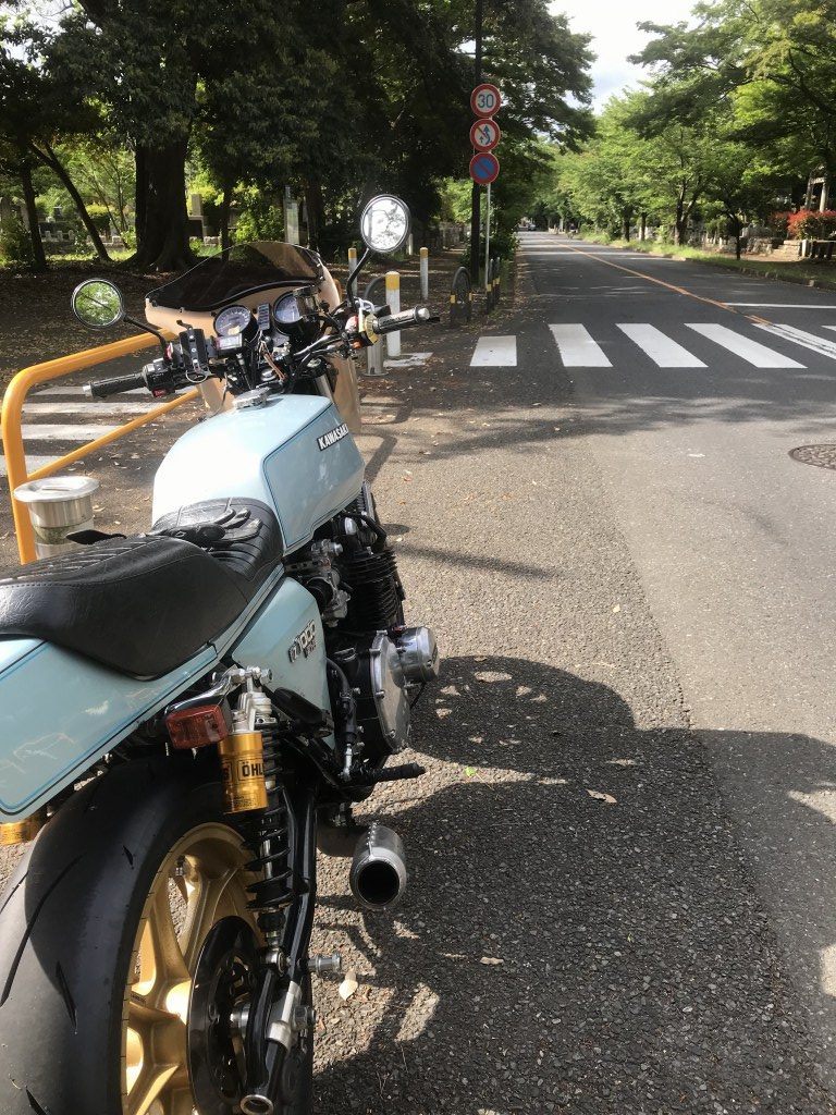 フロントカウルとブレーキレバーの干渉を避けるため、グリップ周りを外側に少し出します。Z1Rはハンドル幅を少し拡大すると、たいていの場合収まりが良くなります。