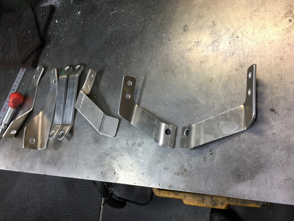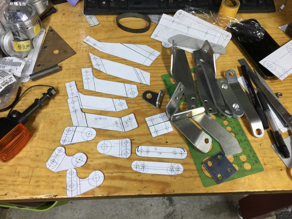 フロントカウルのブラケットを現車合わせで製作しますが、カウルの陰にかくれていて、且つ3次元的な形状なので、寸法を決めるまでに何度か試作しながら最終形状に仕上げていきます。今回も型紙は5通り、現物は3セット製作してやっと最終形状に。
