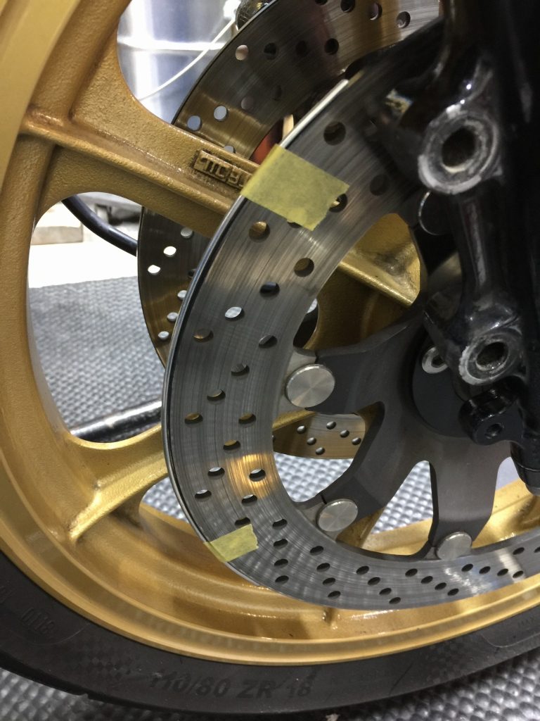 キャリパーサポートは現車合わせで設計します。先ず、ローター外周にキャリパーのクリアランスを取るためのワイヤーを貼り付けます。