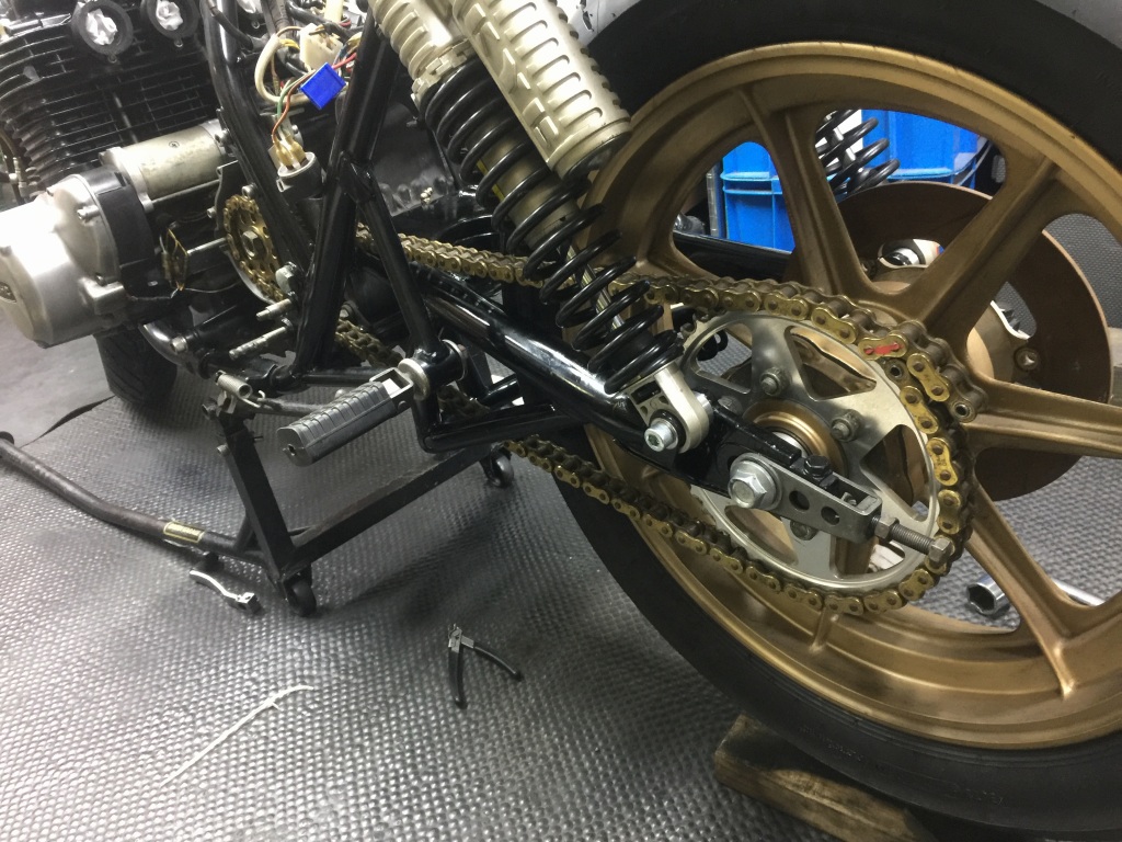 以前のアルミスイングアームがかなり長かったようで、元のチェーンを合わせてみると4コマほど切り詰める必要がありそうです。