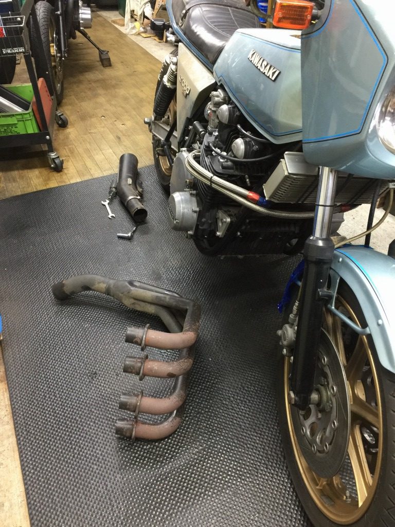 オイル交換するのでKERKERマフラーを外しますが、フレームとのクリアランスが特に狭くて脱着に時間がかかります。