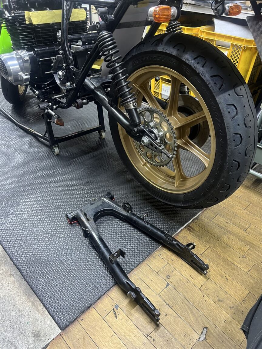 ワークスタイプのスイングアームを製作します。素材はZ1Rの純正スイングアームです。