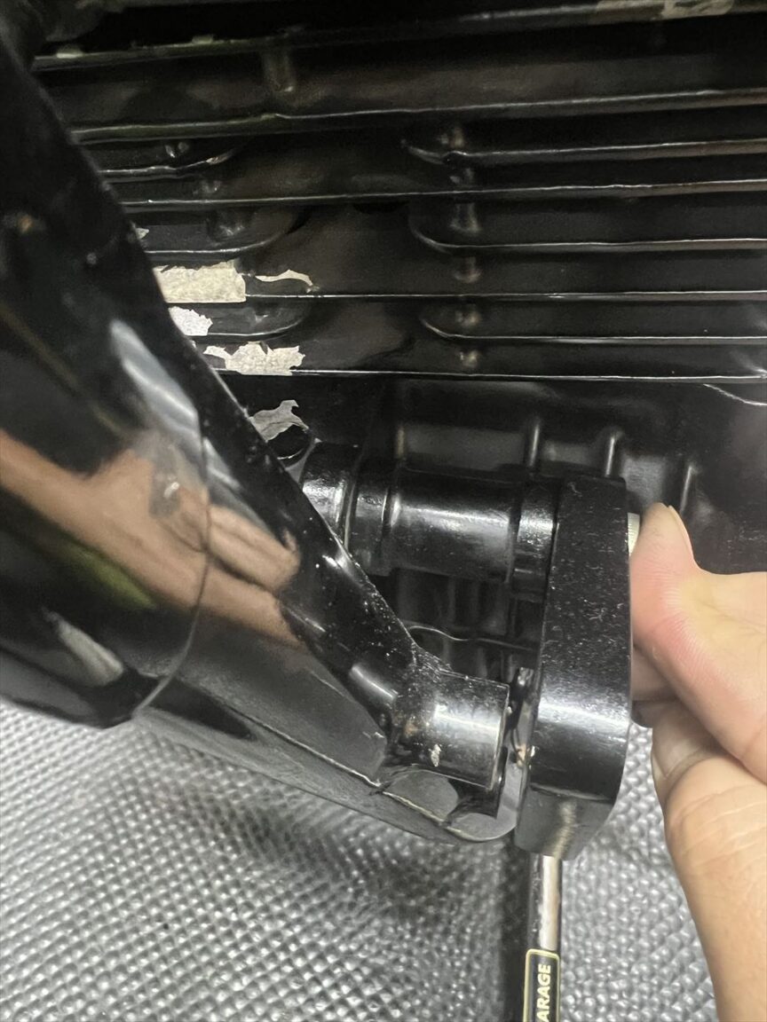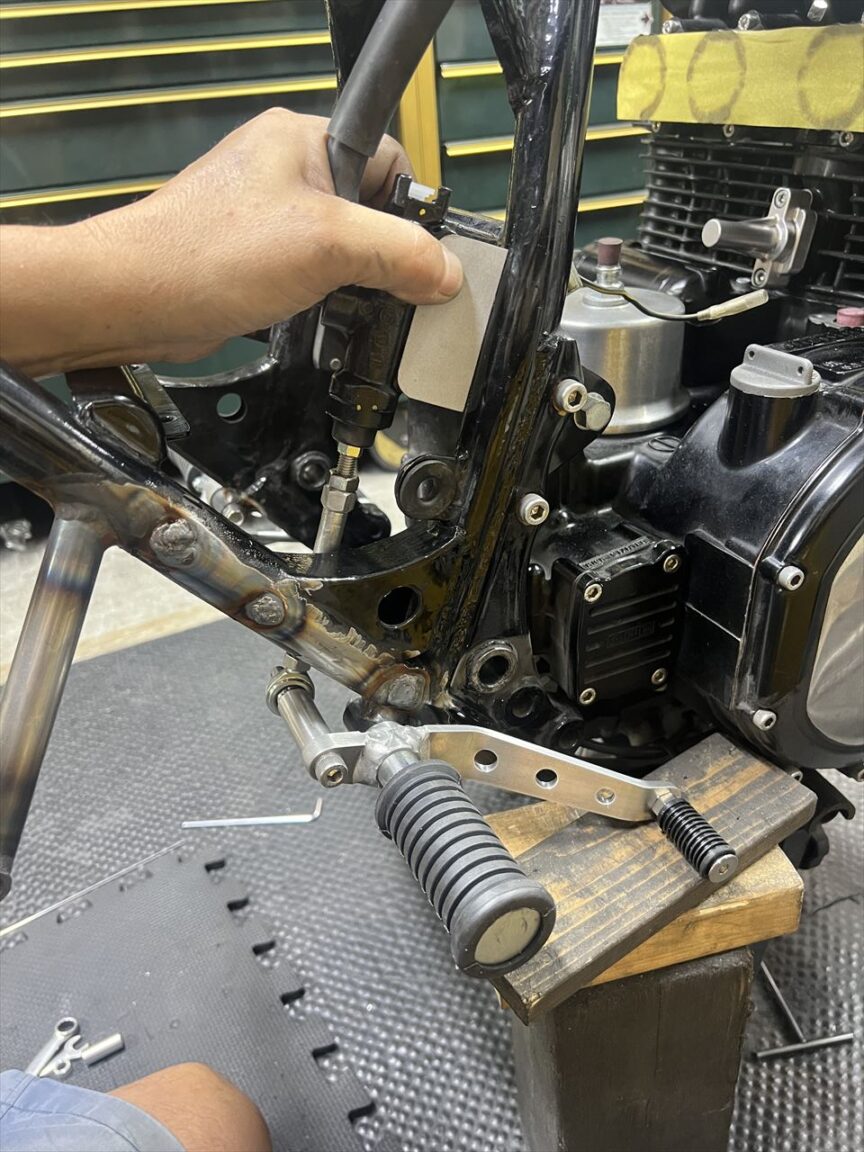 マフラー取り付けの前にエンジンマウントの不具合を修正します。左前のマウントもプレート式に改造されていましたが、カラーが長過ぎてプレートが斜めに付いていました。