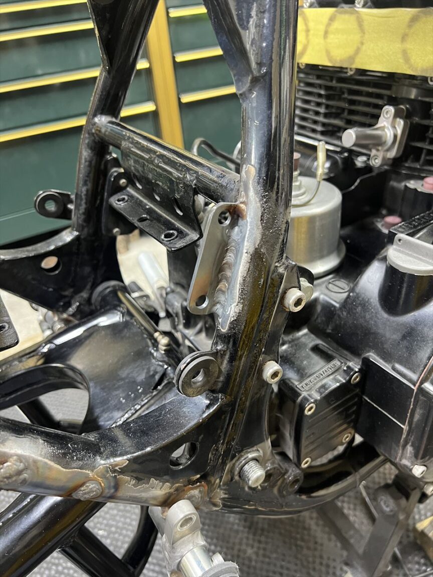 ステーをフレームに溶接します。これでフレームリヤ周りの溶接関係は全て付きました。