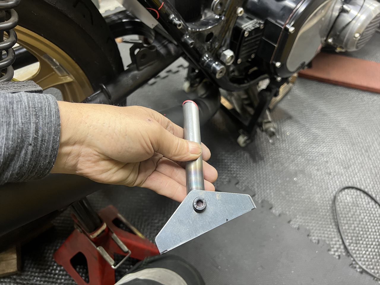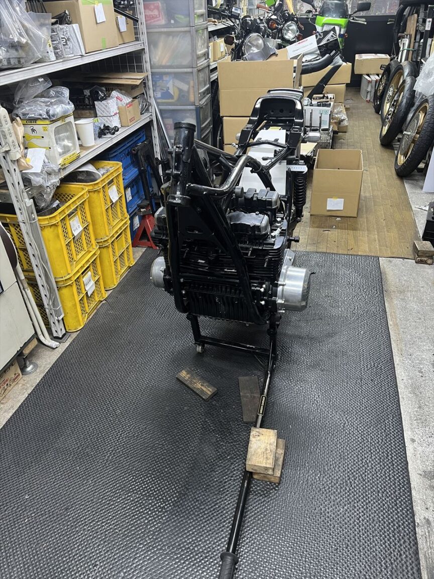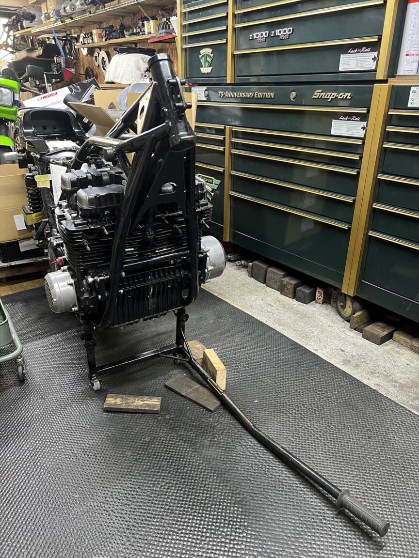 新しく取り付けるマフラー用のステーを製作します。モチーフはカワサキワークスのMk2レーサーです。