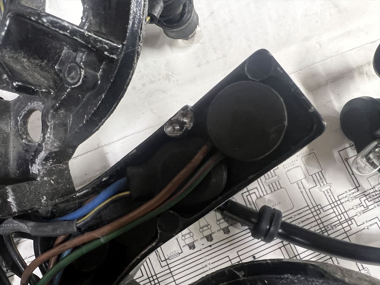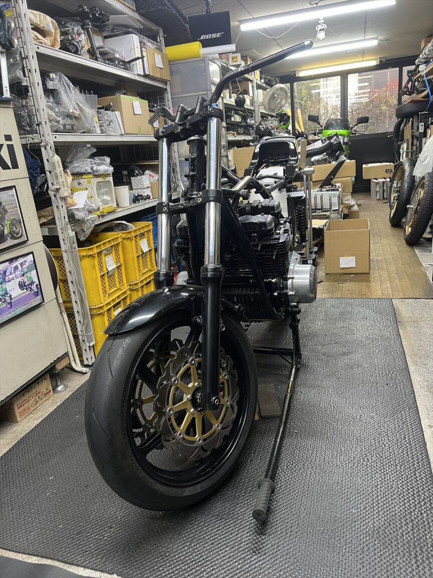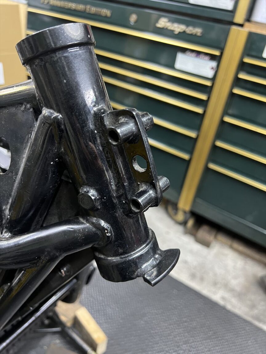 既存のメーターブラケットは、マウント部分の下側が削られています。組み合わせていた社外のステムに干渉するので逃げを作ったようです。