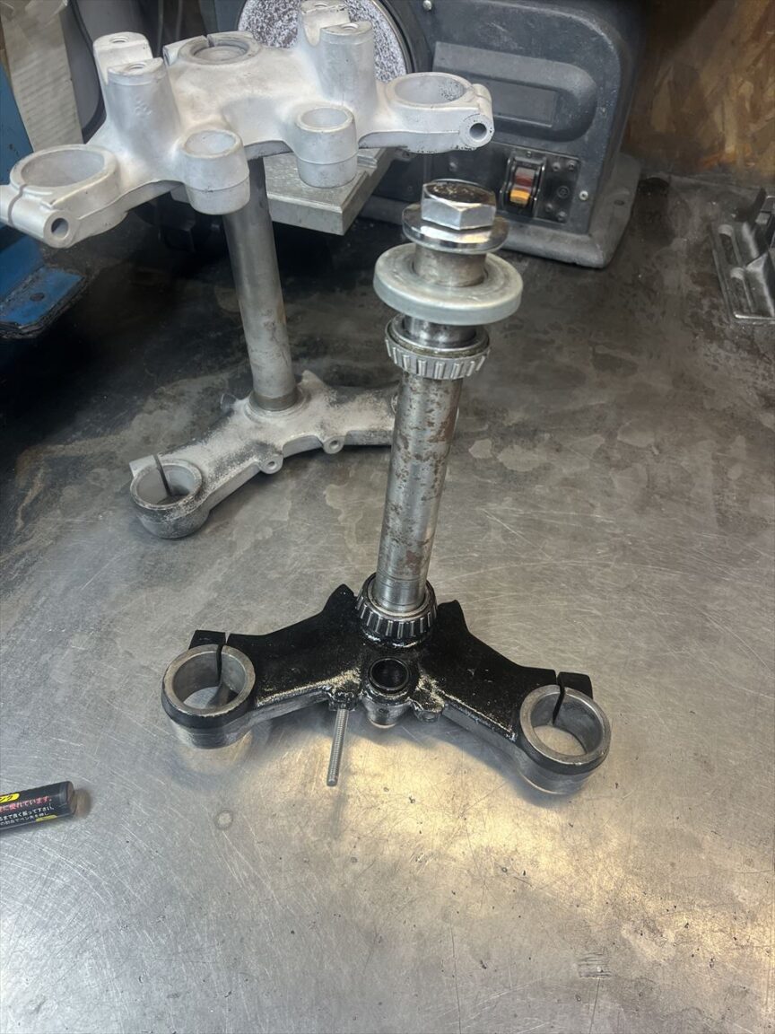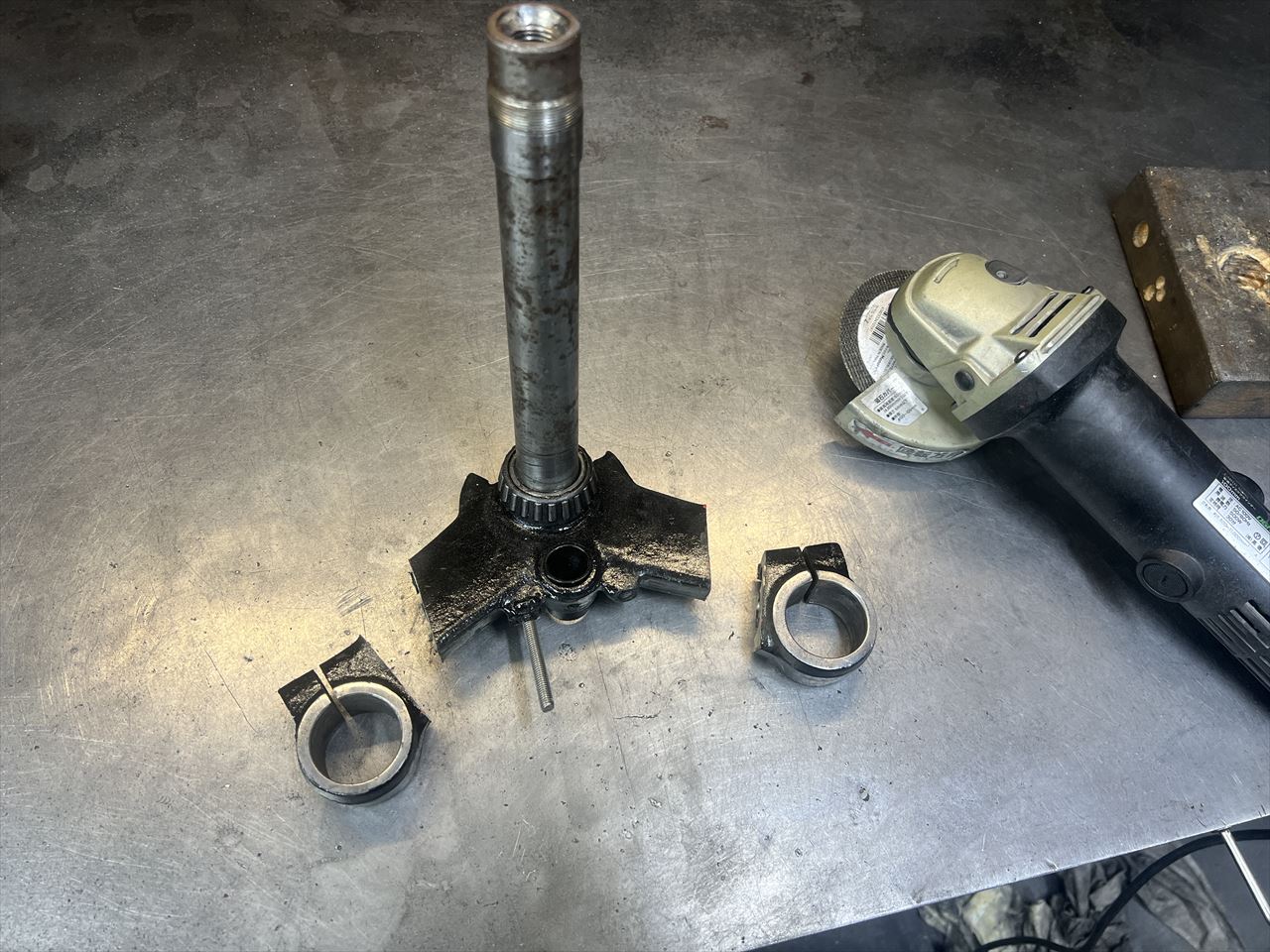 ステムはザッパーステムに変更しますが、ワークスMk2同様にアンダーステムのクランプをダブルにします。素材は手前にあるZ1000A純正です。