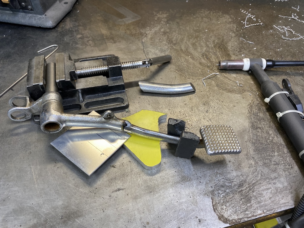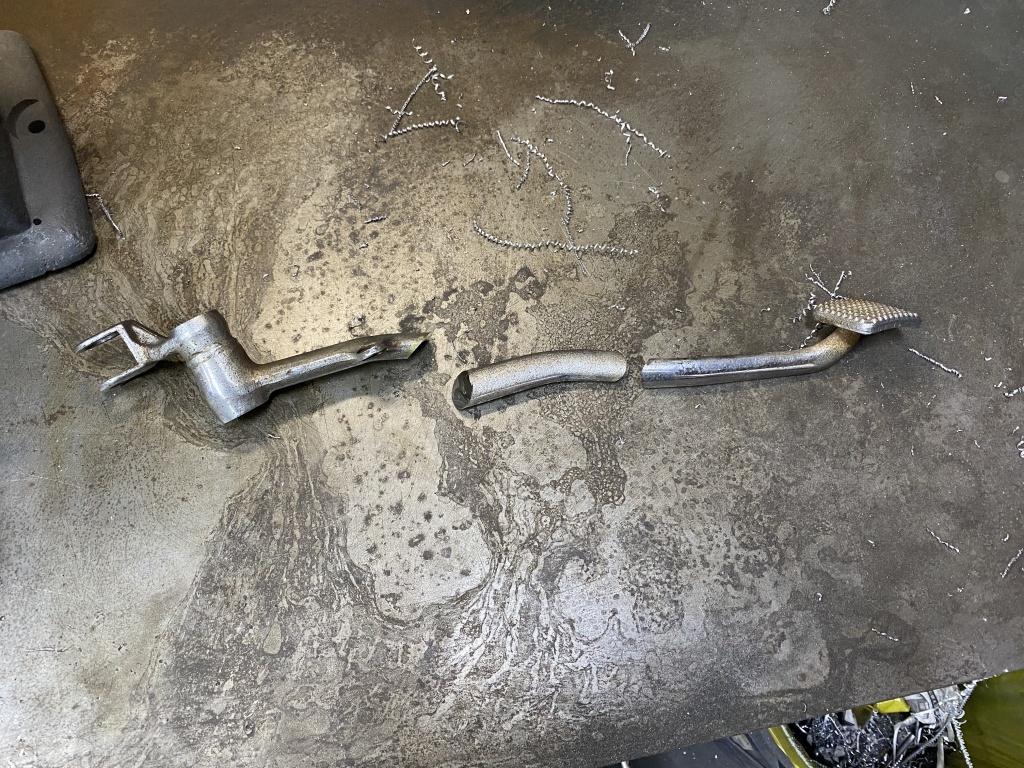 ワークスバックステップVer.1用に純正ブレーキペダルをショート化します。先ずは3つに分割します。