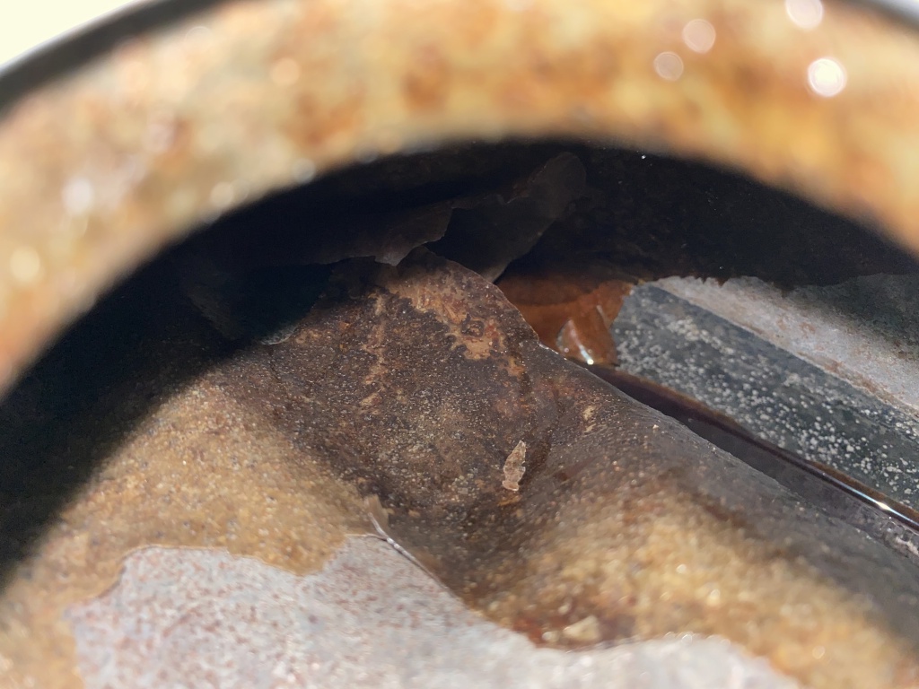 内部を覗くと、古いコーティングが大部分で剥がれています。不十分なサビ取りの上にコーティングしたようで、長期保管で再び錆びて剥離したようです。重さの原因も、底に大量にコーティング剤が固まって堆積しているためでした。厚さは1センチ弱ほどあります。
