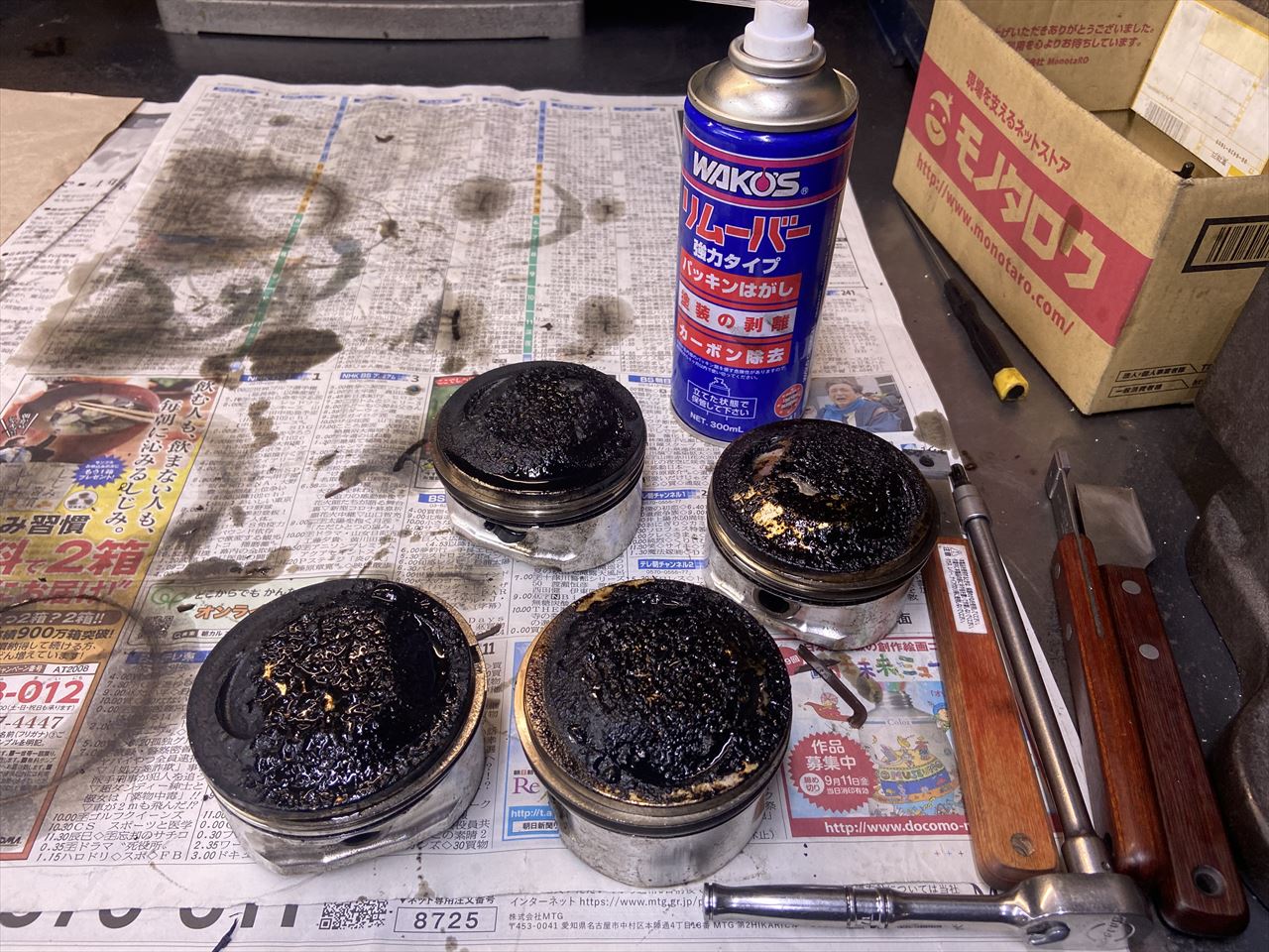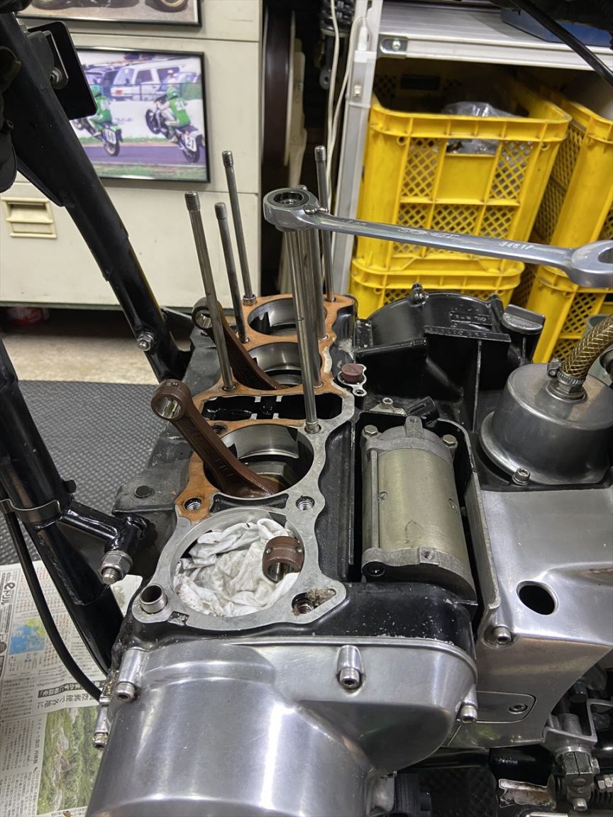 固着したベースガスケット剥がしの続きです。前回はここまでで2時間かかりました。スタッドボルトも一旦抜いて、作業性のいい状態で臨みます。