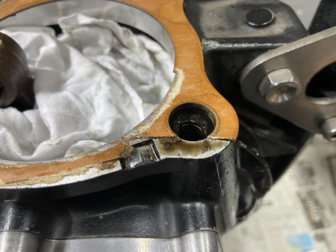 こちらがオイルリークの跡の一部です。4隅4本のシリンダースタッドはオイル通路となっているので、内部から油圧が掛かります。ガスケットとケースのアルミが貼り付いていればオイル漏れはおきませんが、剥離してくるとこのようにオイルが隙間を通って漏れ出てきます。硬いガスケット材とボーリングして幅の狭くなったケースにより、数年間のヒートサイクルで剥離して漏れ出てきたと思われます。今回は別のガスケットを使用して組み付けます。