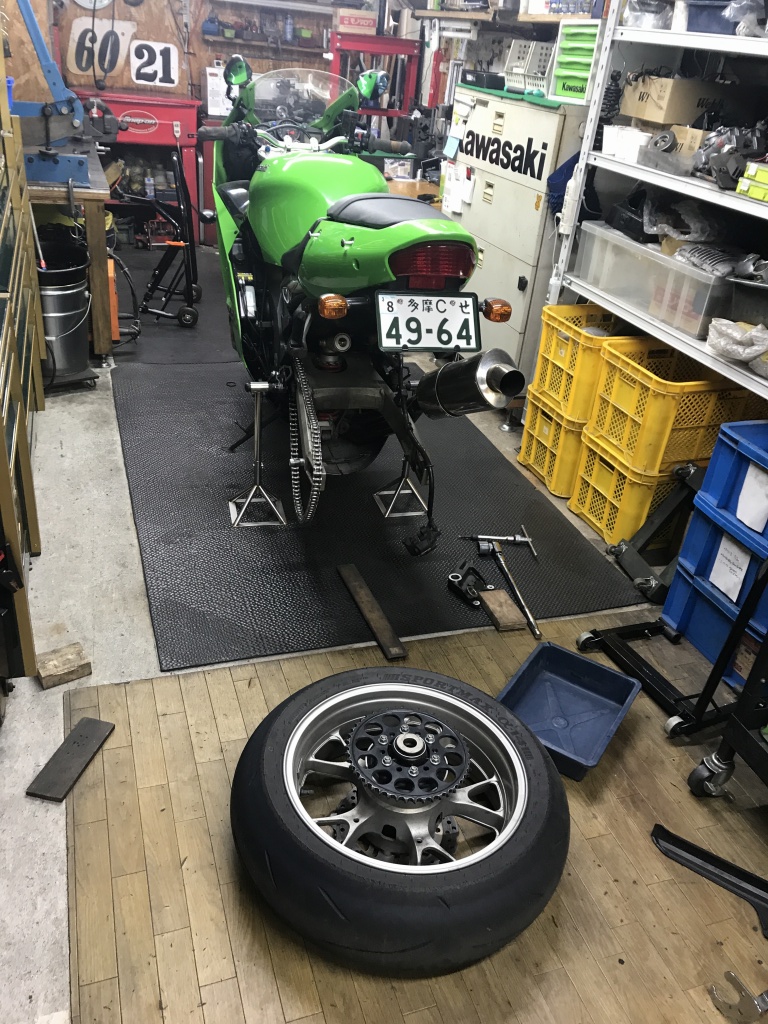 社用車の12Rです。懸案だったホイールとスイングアームの塗装を実行することに。