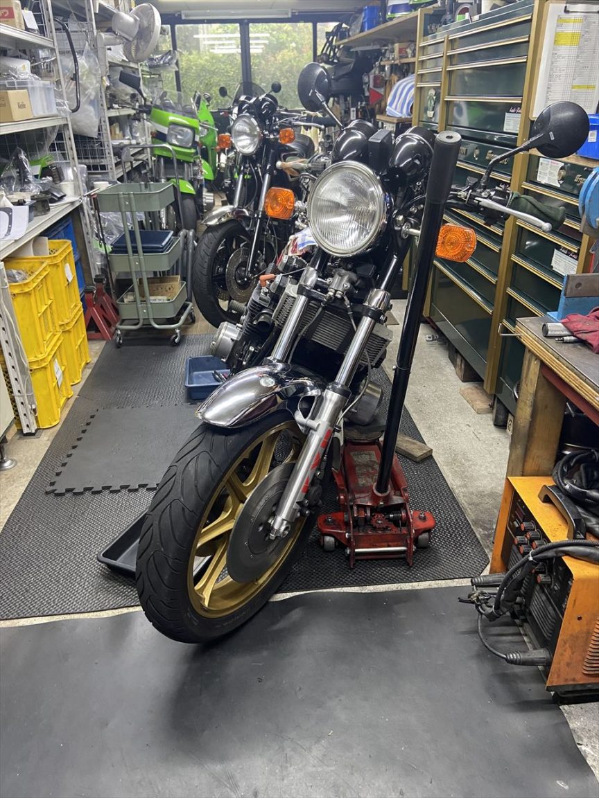 バイクはエンジン腰上を分解組立終了した直後で、マフラーを付ける前に少し寝かして作業を行います。